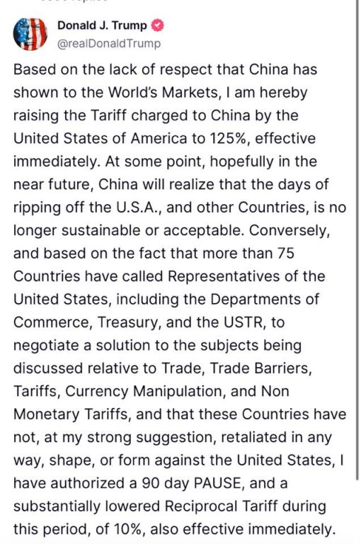 बुधबार दिउँसोको शुरूमा, ट्रम्पले विश्वका लगभग सबै देशहरूमा हालै लागू गरेको विश्वव्यापी करलाई आगामी ९० दिनका लागि १० प्रतिशतमा झारेको घोषणा गरेको बताए । यो ट्यारिफ यसअघि चीन बाहेकका देशमा ५० प्रतिशतसम्म लागू गरिएको थियो।