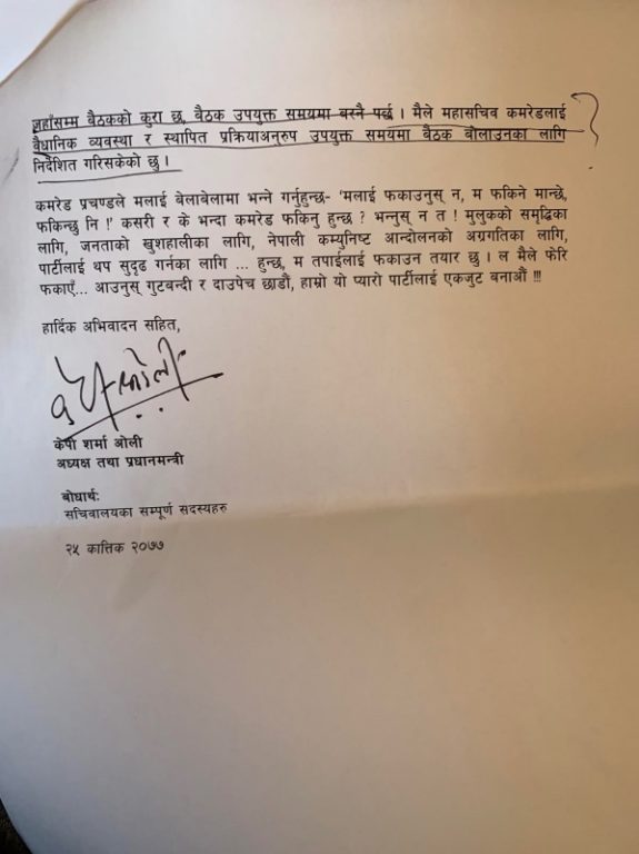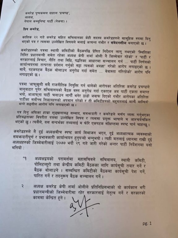 काठमाडौं, २९ कार्तिक । सत्तारुढ नेकपाको सचिवालयको बैठक राख्न सहमति खोज्दै कात्तिक २२ गते अध्यक्ष पुष्पकमल दाहाल प्रचण्डसहित पाँच जना सचिवालय सदस्यले प्रधानमन्त्री तथा अर्का अध्यक्ष केपी शर्मा ओलीलाई लिखित पत्र बुझाए।
