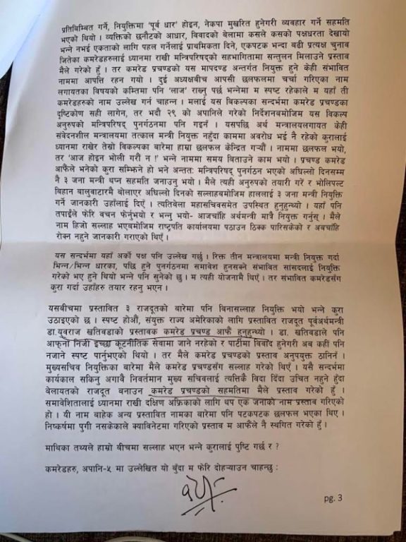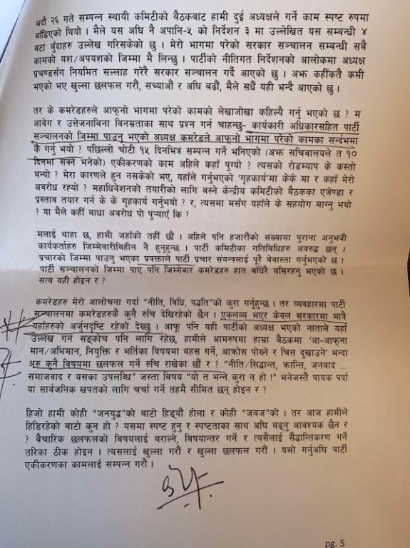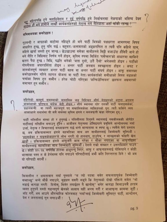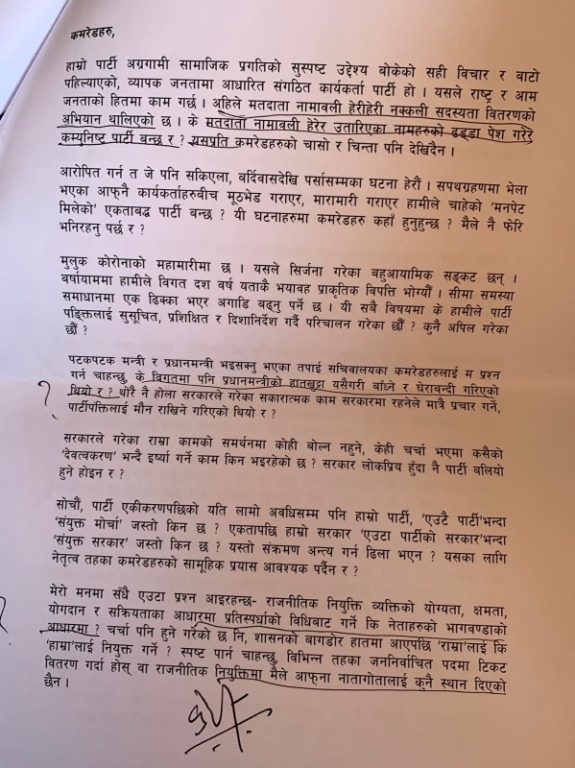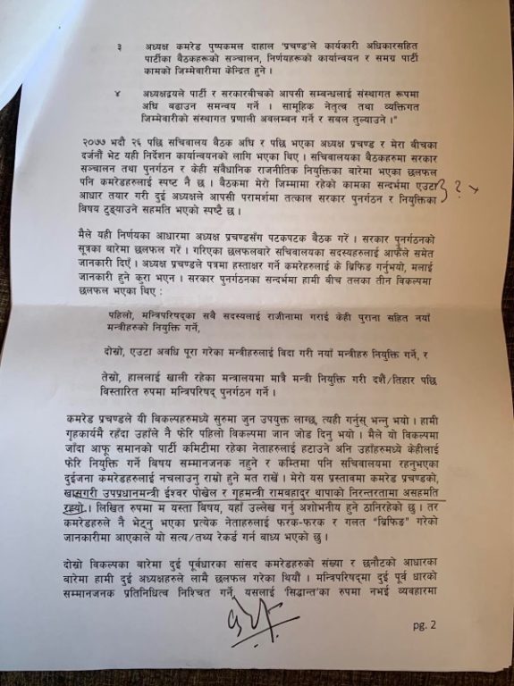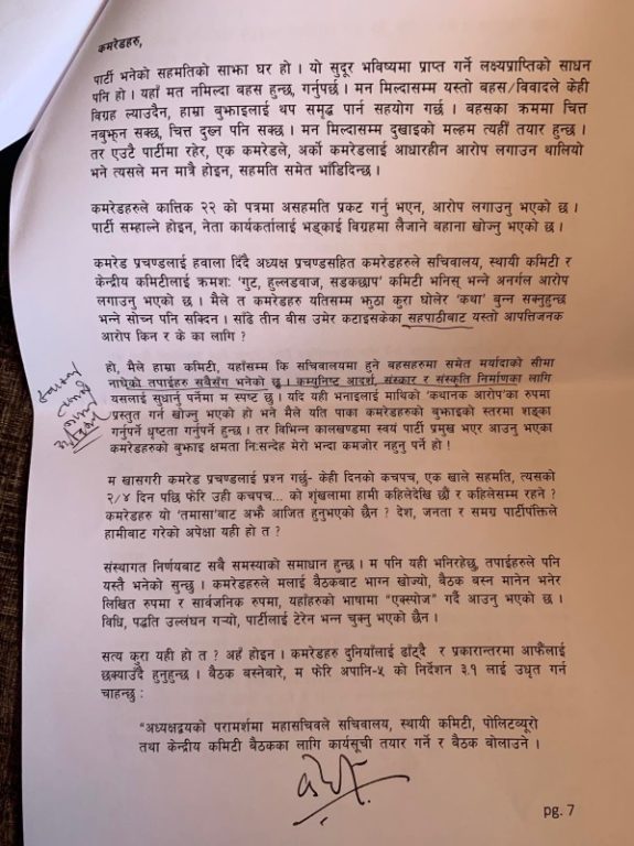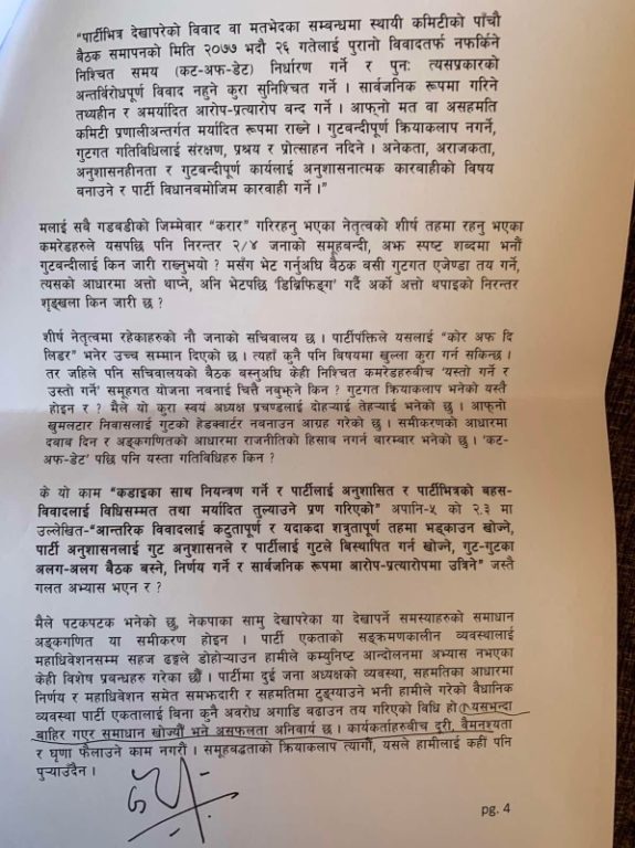 त्यसयता नेकपाको ओली र प्रचण्ड–माधव नेपाल समूहबीच ‘पत्र–युद्ध’ चलिरहेको छ। प्रधानमन्त्री ओलीले प्रचण्डसहित पाँच जनालाई १० पेज लामो जवाफी पत्र लेख्नु भएको छ भने प्रचण्डले त्यसको पनि फेरि जवाफ दिनुभएको छ । कात्तिक २२ गते प्रचण्डसहित सचिवालयका ५ नेताले बालुवाटारमा पुगेर प्रधानमन्त्री ओलीलाई बैठक माग गर्दै दुईपृष्ठको पत्र बुझाएका थिए । सोही पत्रको जवाफमा ओलीले २७ गते प्रचण्डलाई पत्र लेख्नु भएको हो । मन्त्रिपरिषद् पुनर्गठन लगायतका काम सहमतिमै भएको तर निश्चित शीर्ष नेताहरुको अतृप्त आंकाक्षाका कारण बलजफ्ती पार्टीमा विवाद सिर्जना गरिएको ओलीको दाबी छ । नेताहरुलाई उहाँको प्रश्न छ, सरकार परिर्वतनको दौडधूप किन ?’