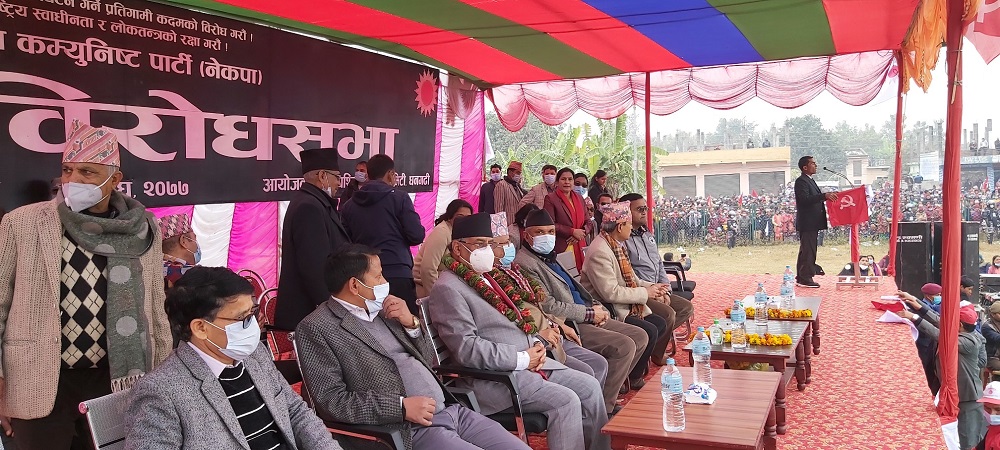धनगढी, १७ माघ । नेपाल कम्युनिस्ट पार्टी (नेकपा) का अध्यक्ष पुष्पकमल दाहाल प्रचण्डले केपी शर्मा ओलीले आफैमाथि कलंकको टीका लगाएको आरोप लगाउनुभयो । नेकपा प्रचण्ड–नेपाल समूहले आज धनगढीमा आयोजना गरेको विरोधसभालाई सम्बोधन गर्दै प्रचण्डले संविधान विपरित प्रतिनिधि सभा विघटन गरेर प्रधानमन्त्री ओलीले इतिहासमै धेरै दाग लाग्ने गरी कलंकको टीका लगाएको बताउनुभयो ।