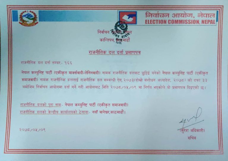 काठमाडौं, ९ भदौ । नेकपा एमालेबाट अलग भएका नेताहरुले गठन गरेको पार्टी नेकपा एकीकृत समाजवादी निर्वाचन आयोगमा दर्ता भएको छ । एमालेका पूर्वमहासचिव एवं पूर्वप्रधानमन्त्री माधवकुमार नेपाल अध्यक्ष रहेको नेकपा एकीकृत समाजवादीलाई बुधबार आयोगले दर्ता प्रमाणपत्र दिएको हो ।
