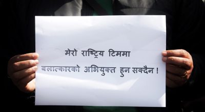 प्रदर्शनकारीले बलात्कार आरोपी र उनलाई साथ दिने दुवैलाई बहिष्कार गर्नुपर्ने आशयका नारा लेखेको प्लेकार्ड बोकेका थिए । एक नाबालिकालाई बलात्कार गरेको अभियोग क्रिकेटर सन्दीप लामिछानेविरुद्ध जिल्ला अदालत काठमाडौंमा विचाराधीन छ। तर क्रिकेट संघले उनलाई राष्ट्रिय टिममा फर्काएपछि विरोध भइरहेको छ ।