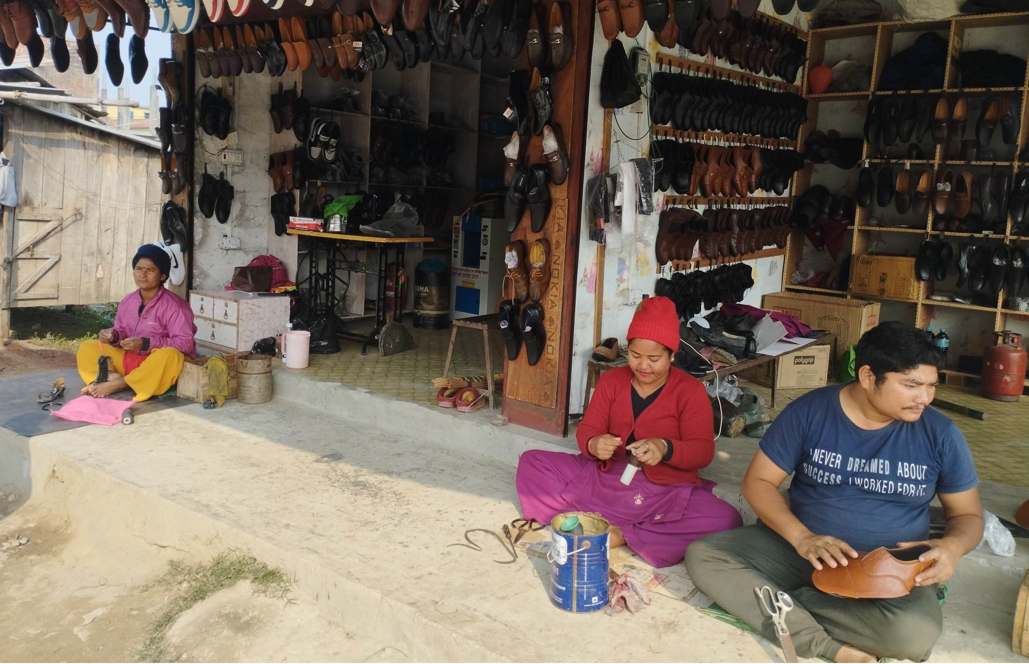 सन्तोषी नेपालीका श्रीमानले लामो समयदेखि छाला जुत्ता पसल गरे । यहाँको कमाइमा चित्त नबुझेपछि जुत्ता बनाउने सीप श्रीमतीलाई सिकाएर उनी हाल विदेशमा छन् । अचेल पसल उनकी श्रीमती सन्तोषीले चलाइरहेकी छन् । सन्तोषीले जुत्ता, चप्पल आफैँ बनाउनेसमेत गरेकी छन् । “श्रीमानबाट मैले सीप सिकेँ, यहाँको कमाइले पुग्दैन भन्दै उहाँ विदेश जानुभयो”, सन्तोषी भन्नुहुन्छ, “साँझ–बिहान घरको काम गर्छु । दिउँसो पसल आफैँले चलाएकी छु । जुत्ता बनाउन पनि सिकेकी छु । पसल चलेको छ ।”
