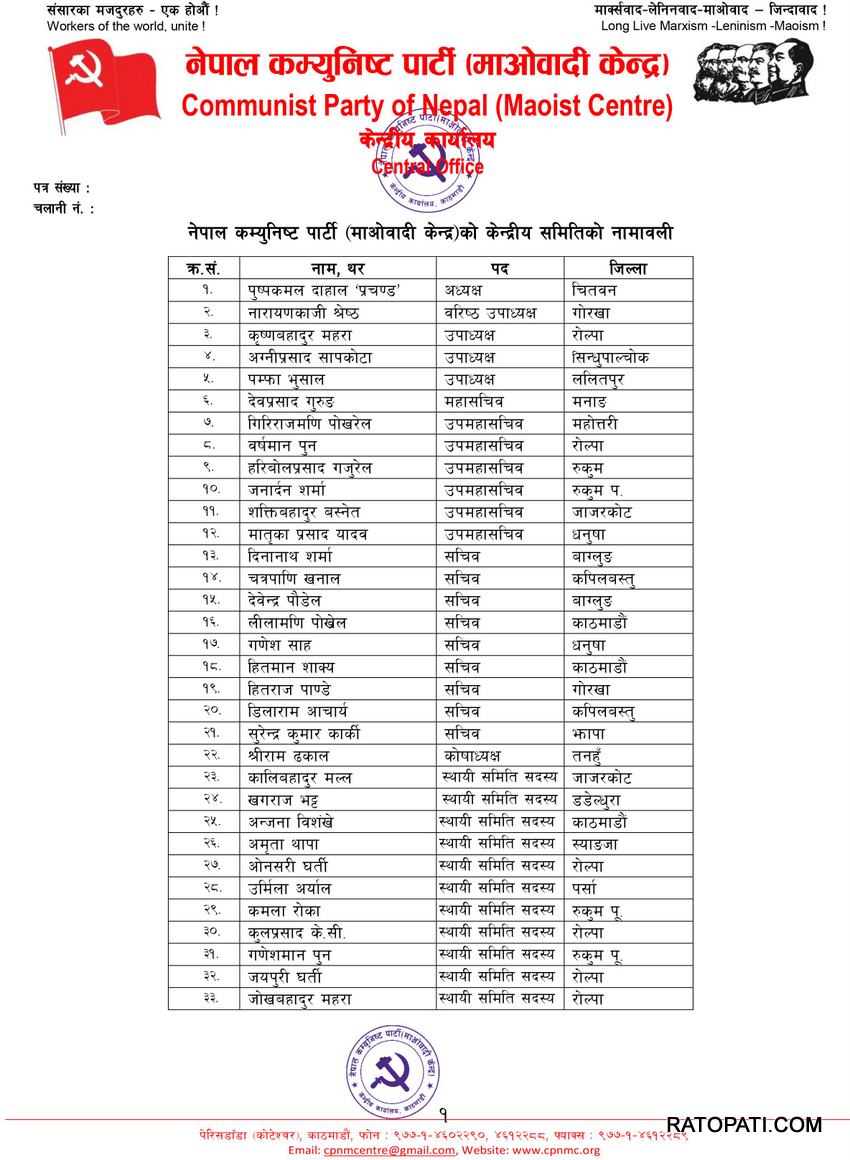 पदाधिकारीसहित स्थायी समिति, केन्द्रीय समिति र वैकल्पिक केन्द्रीय समितिमा रहेका सदस्यहरुको सूची