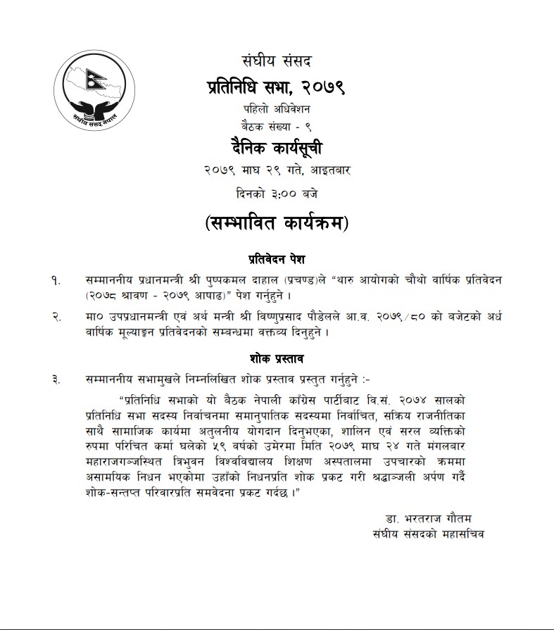 बैठकमा सभामुख देवराज घिमिरेले शोक प्रस्ताव पनि प्रस्तुत गर्ने सम्भावित कार्यसूची रहेको संघीय संसद्का महासचिव डा.भरतराज गौमतले जानकारी दिए ।