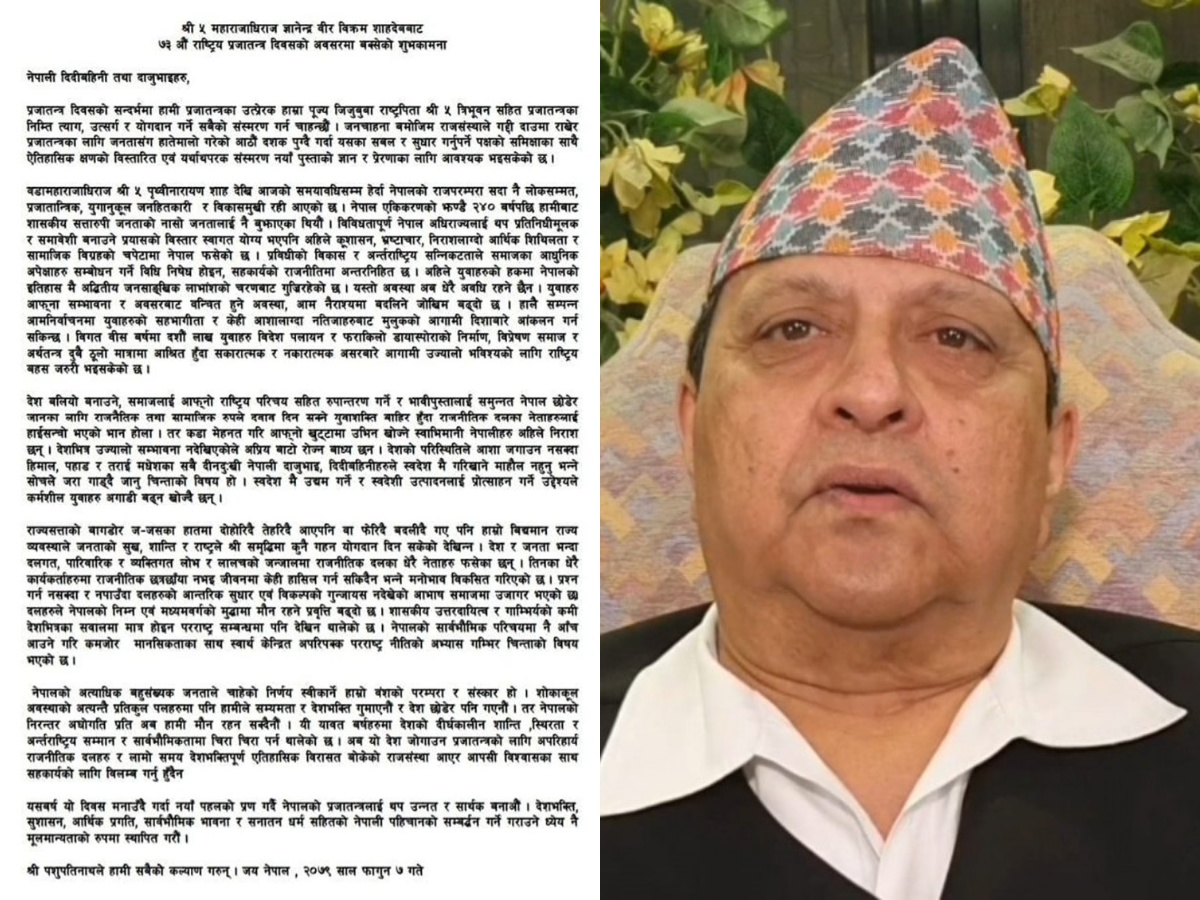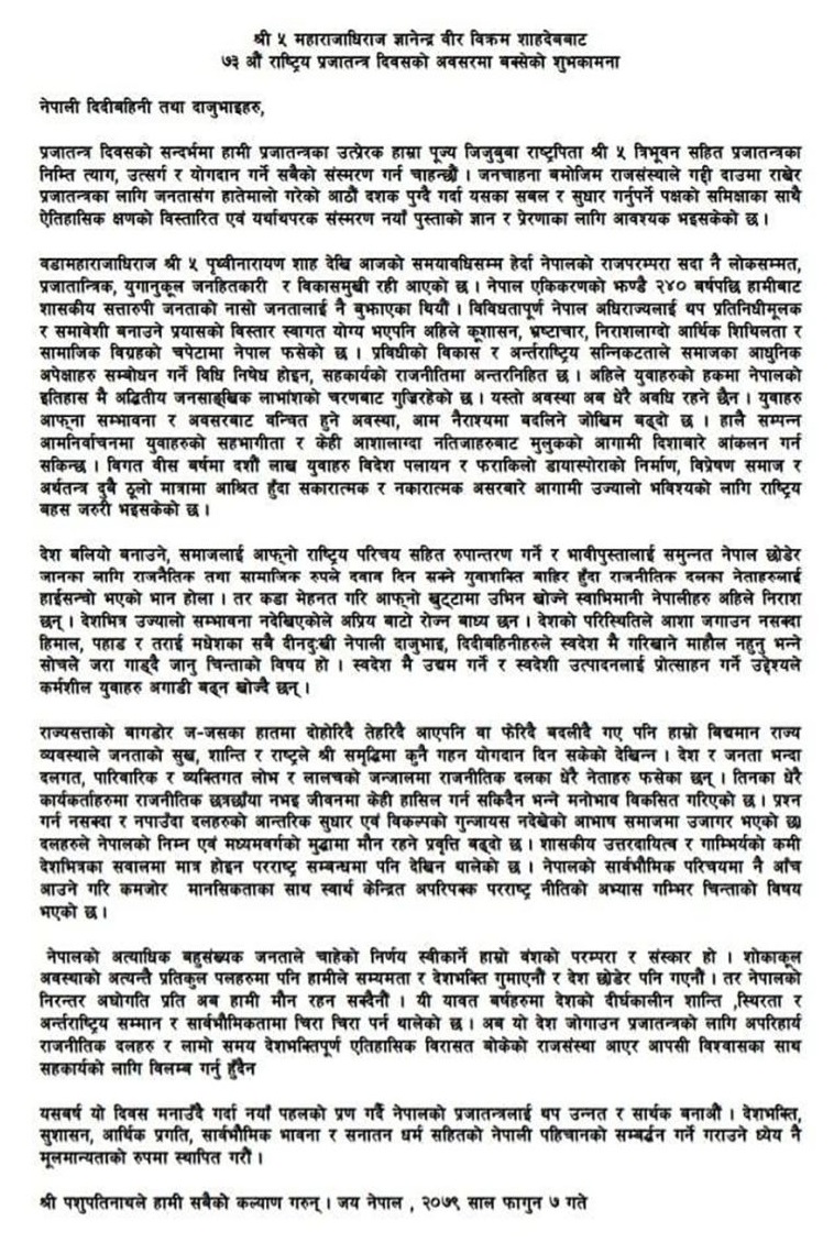 पछिल्ला वर्षमा देशको दीर्घकालीन शान्ति, स्थिरता र अन्तर्राष्ट्रिय सम्मान र सार्वभौमिकतामा चिराचिरा पर्न थालेको भन्दै शाहले चिन्ता व्यक्त गर्नुभएको छ । उहाँले देशको परिस्थितिले आशा जगाउन नसक्दा हिमाल, पहाड र तराई मधेसका सबै दीनदुःखीलाई गरी खाने वातावरण बन्न नसकेको बताएका छन् ।
