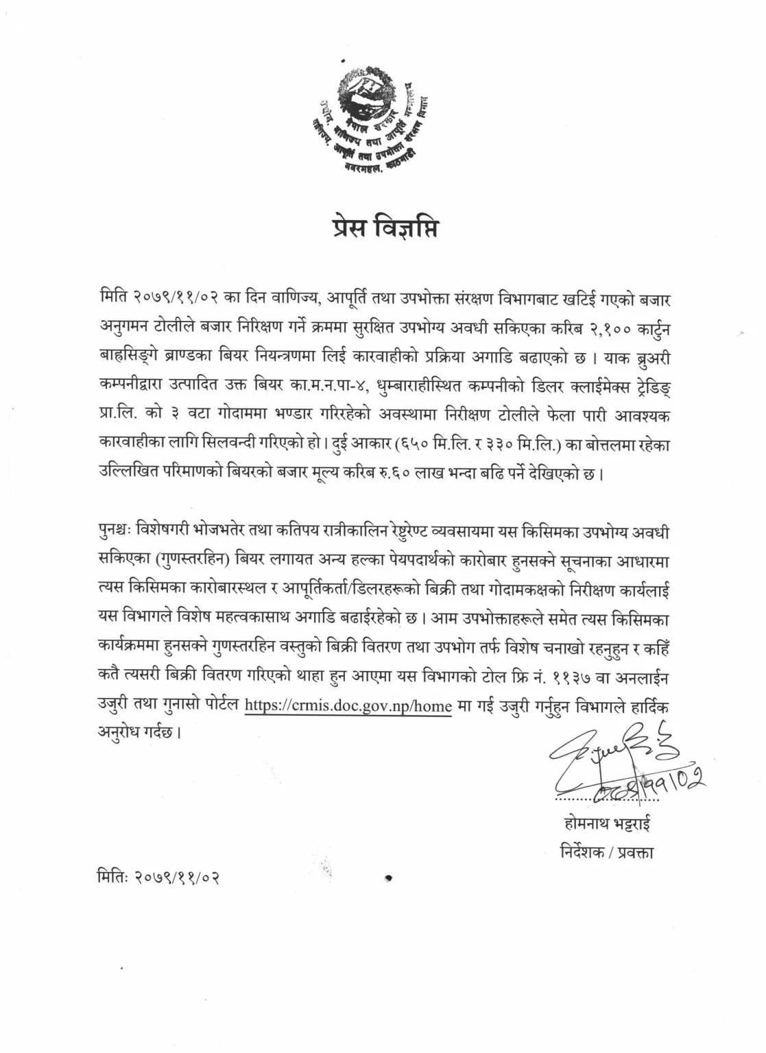विभागका निर्देशक तथा प्रवक्ता होमनाथ भट्टराईद्वारा जारी विज्ञप्तिअनुसार उपभोग्य अवधी सकिएका करीव २१ सय कार्टुन बाह्रसिंगे ब्राण्डका बियर नियन्त्रणमा लिइएको छ । सो बियर कम्पनीलाई कारबाही प्रक्रिया अगाडि बढाइएको छ । ‘याक ब्रुअरी कम्पनीद्वारा उत्पादित उक्त बियर काठमाडौं महानगरपालिका ४ धुम्बाराहीस्थित कम्पनीको डिलर क्लाईमेक्स ट्रेडिङ् प्रा.लि.को ३ वटा गोदाममा भण्डार गरिरहेको अवस्थामा निरीक्षण टोलीले फेलापारि आवश्यक कारबाहीका लागि सिलवन्दी गरिएको हो’, विज्ञप्तिमा भनिएको छ ।