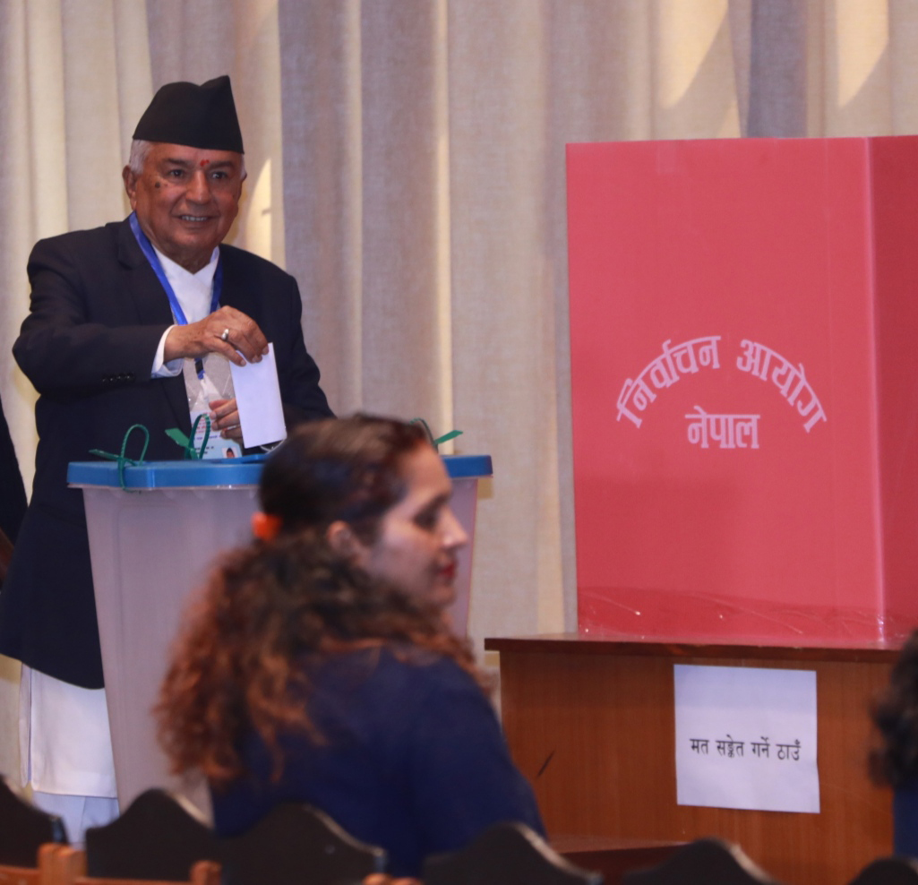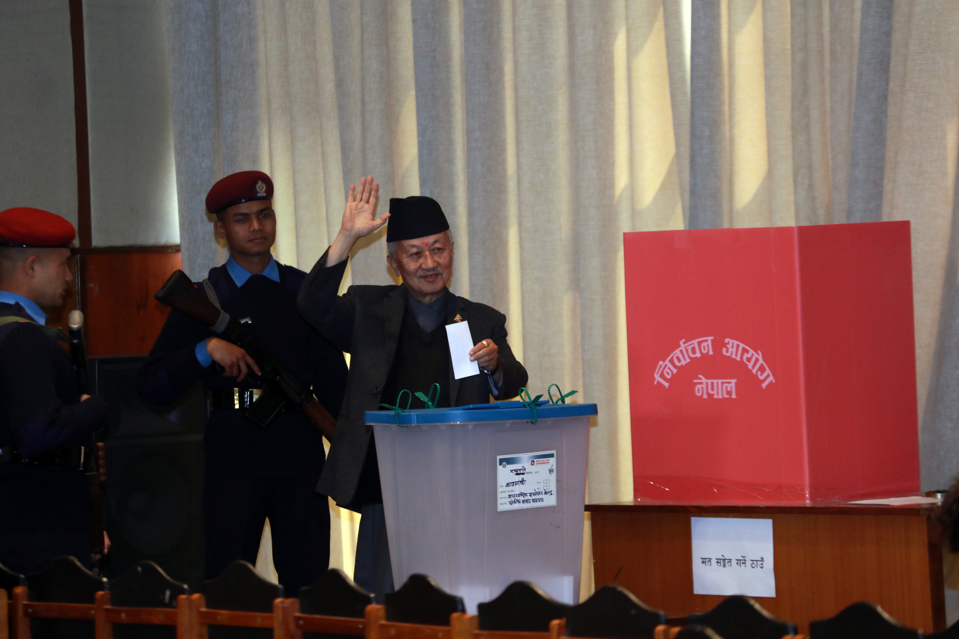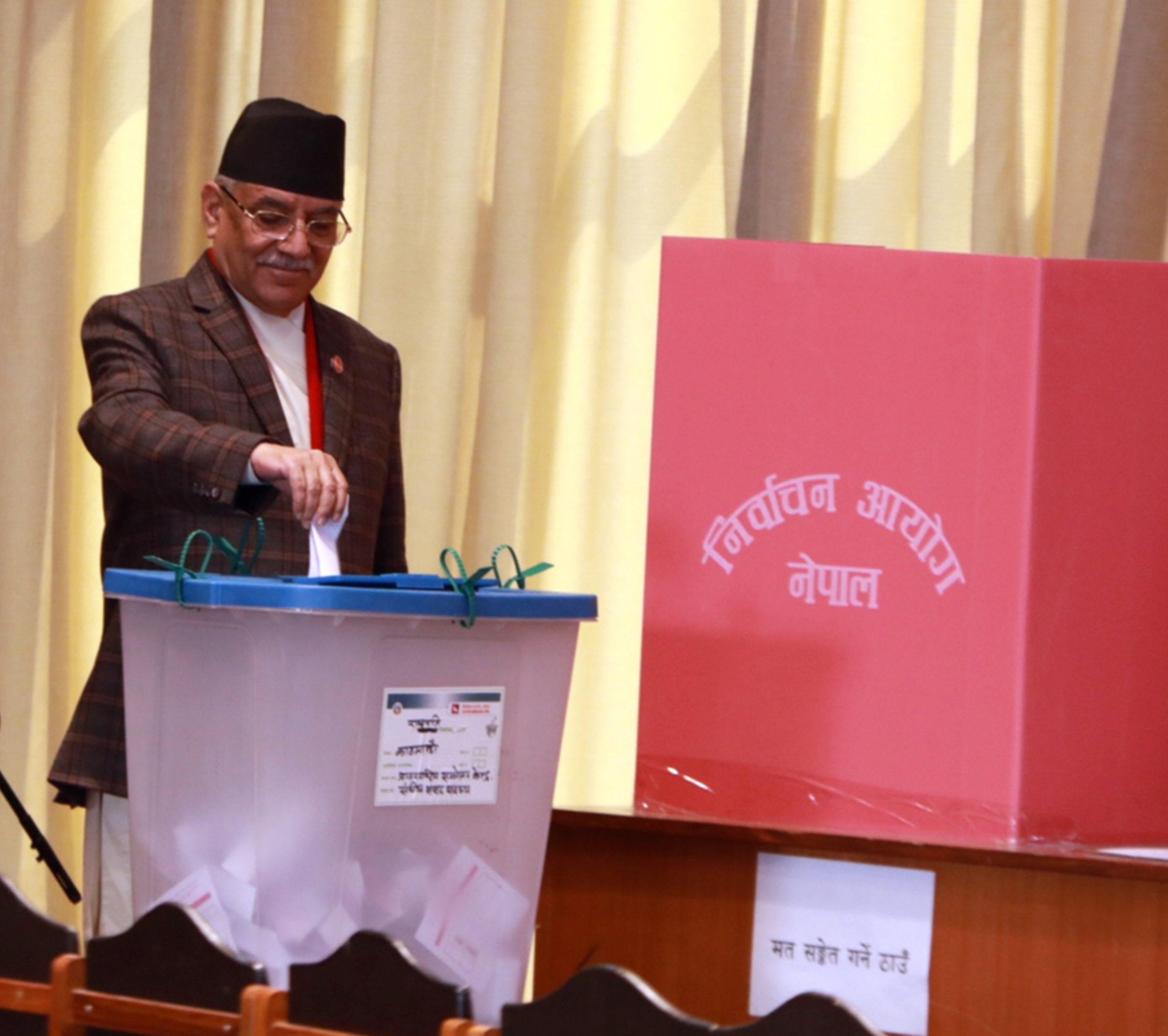 काठमाडौं, २५ फागुन । प्रधानमन्त्री पुष्पकमल दाहाल ‘प्रचण्ड’ले राष्ट्रपति पदको निर्वाचनमा मतदान गर्नुभएको छ । नयाँ बानेश्वरस्थित संसद् भवनको ल्होत्से कक्षमा कायम गरिएको सङ्घीय सांसद मतदान केन्द्रमा उहाँले मतदान गर्नुभएको हो । राष्ट्रपतिका दुवै उम्मेदवार रामचन्द्र पौडेल र सुवासचन्द्र नेम्वाङले यसअघि नै मतदान गरिसक्नुभएको छ । अहिले बिहान १० देखि सुरु भएको मतदान दिउँसो ३ बजेसम्म जारी रहने सहायक निर्वाचन अधिकृत अमृताकुमारी शर्माले जानकारी दिनुभयो । तेस्रो राष्ट्रपतिका लागि नेपाली कांग्रेसका रामचन्द्र पौडेल र नेकपा (एमाले) का सुवासचन्द्र नेम्वाङ प्रतिस्पर्धामा हुनुहुन्छ ।