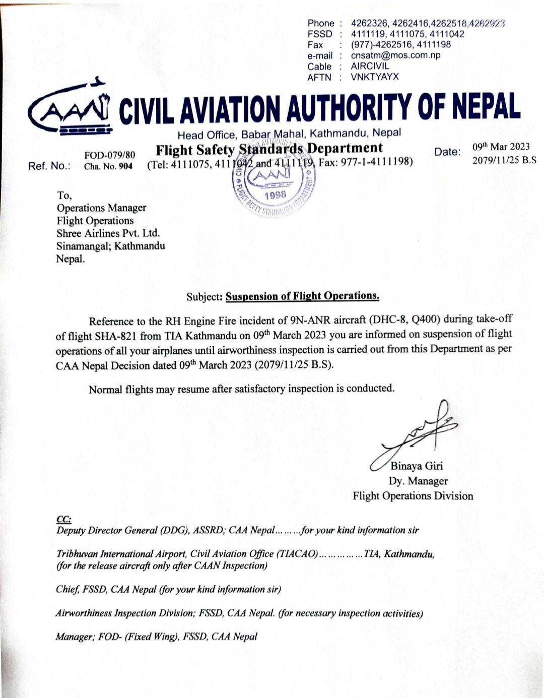 बिहीबार ७८ जना यात्रु बोकेर काठमाडौँबाट भैरहवा उडान भरेको उडान नम्बर ८२१ को जहाजको एक इन्जिनमा आगो लागेको संकेत ककपिटमा देखिएपछि जहाजलाई पुनः त्रिभुवन अन्तर्राष्ट्रिय विमानस्थलमै फर्काएर सुरक्षित अवतरण गरिएको थियो । उक्त विमान काठमाडौँमा अवतरण गराइएपछि प्राविधिकहरूको निगरानीमा राखिएको थियो भने त्यसलाई जाँच गर्ने श्री एयरलाइन्सका दुई प्राविधिकलाई प्राधिकरणले दिउँसै निलम्बन गरेको थियो ।