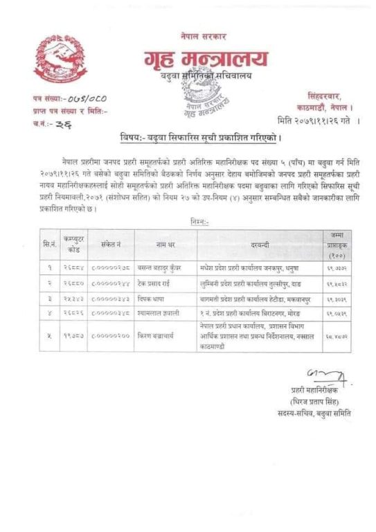 काठमाडौँ, २६ फागुन । नेपाल प्रहरीका रिक्त पाँच एआईजीमा शुक्रबार बढुवा सिफारिस भएको छ । बढुवा समितिले सिफारिस निकालेको हो ।