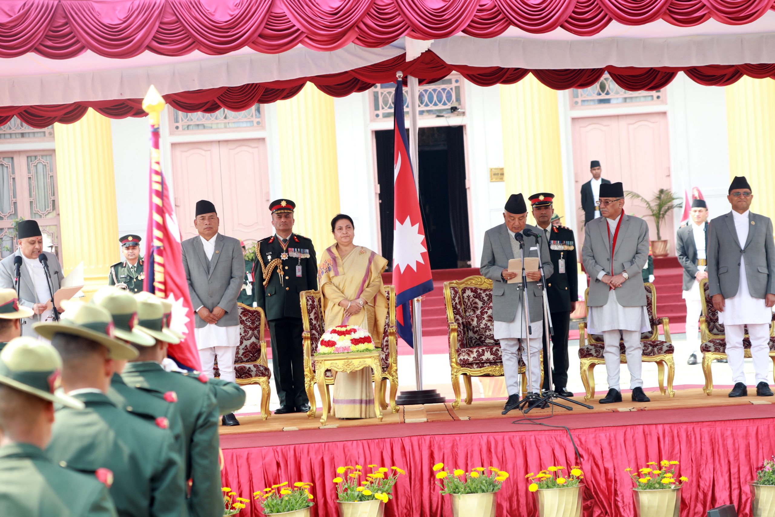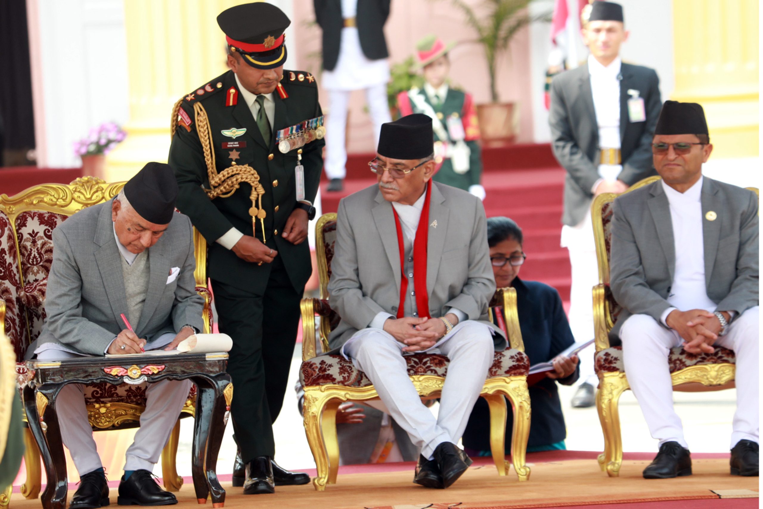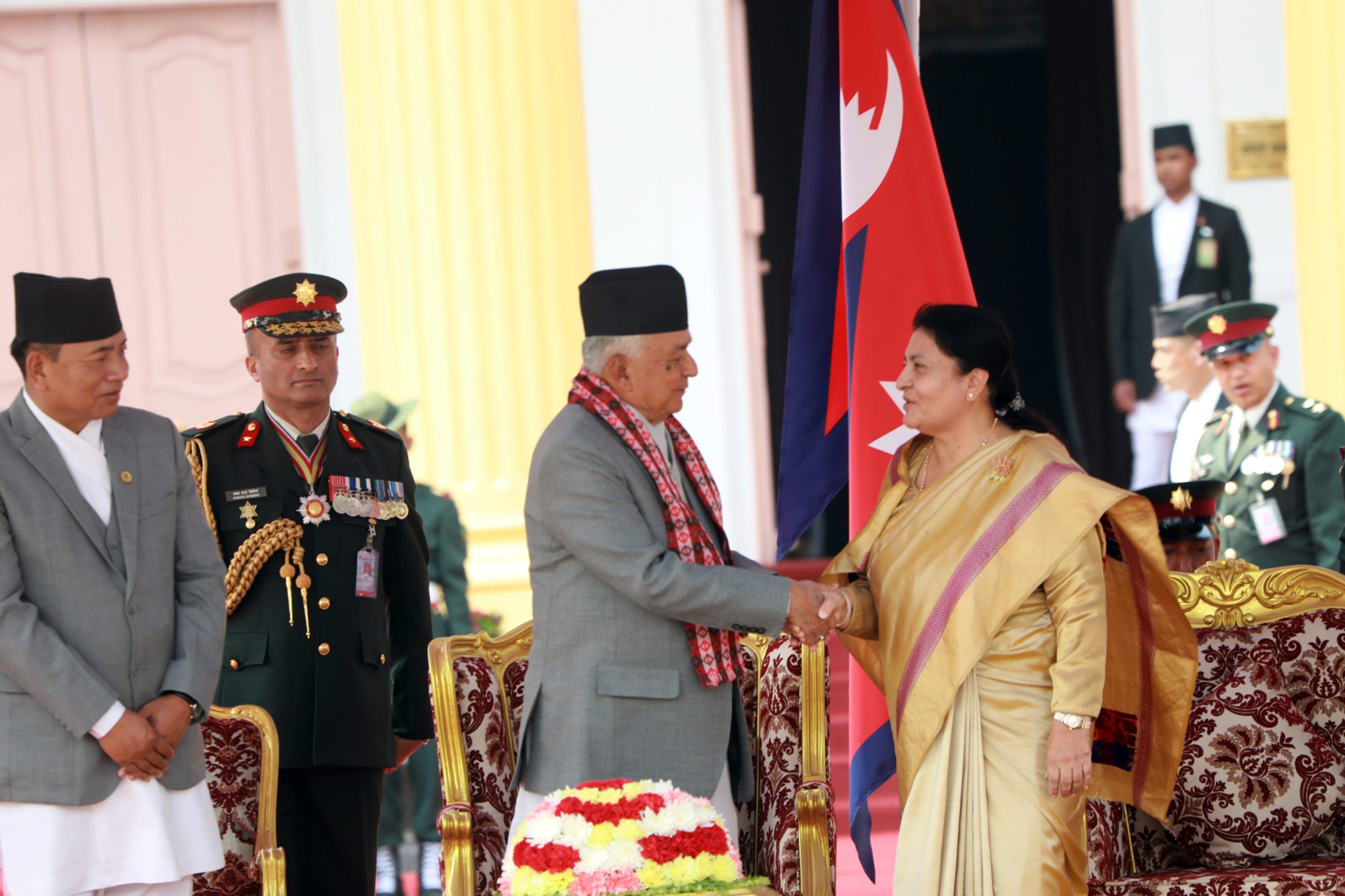 काठमाडौं, २९ फागुन । नवनिर्वाचित राष्ट्रपति रामचन्द्र पौडेलले पद तथा गोपनीयताको शपथ ग्रहण गर्नुभएको छ । राष्ट्रपति कार्यालय, शीतल निवासमा आज आयोजित विशेष समारोहमा नवनिर्वाचित राष्ट्रपति पौडेललाई कामु प्रधानन्यायाधीश हरिकृष्ण कार्कीले शपथ गराउनु भएको हो । उहाँ यही फागुन २५ गते राष्ट्रपति पदमा निर्वाचित हुनुभएको थियो । नेपालको संविधानमा राष्ट्रपतिले आफ्नो कार्यभार सम्हाल्नुअघि सङ्घीय कानुनबमोजिम प्रधानन्यायाधीशसमक्ष पद तथा गोपनीयताको शपथ लिनुपर्ने व्यवस्था छ ।
