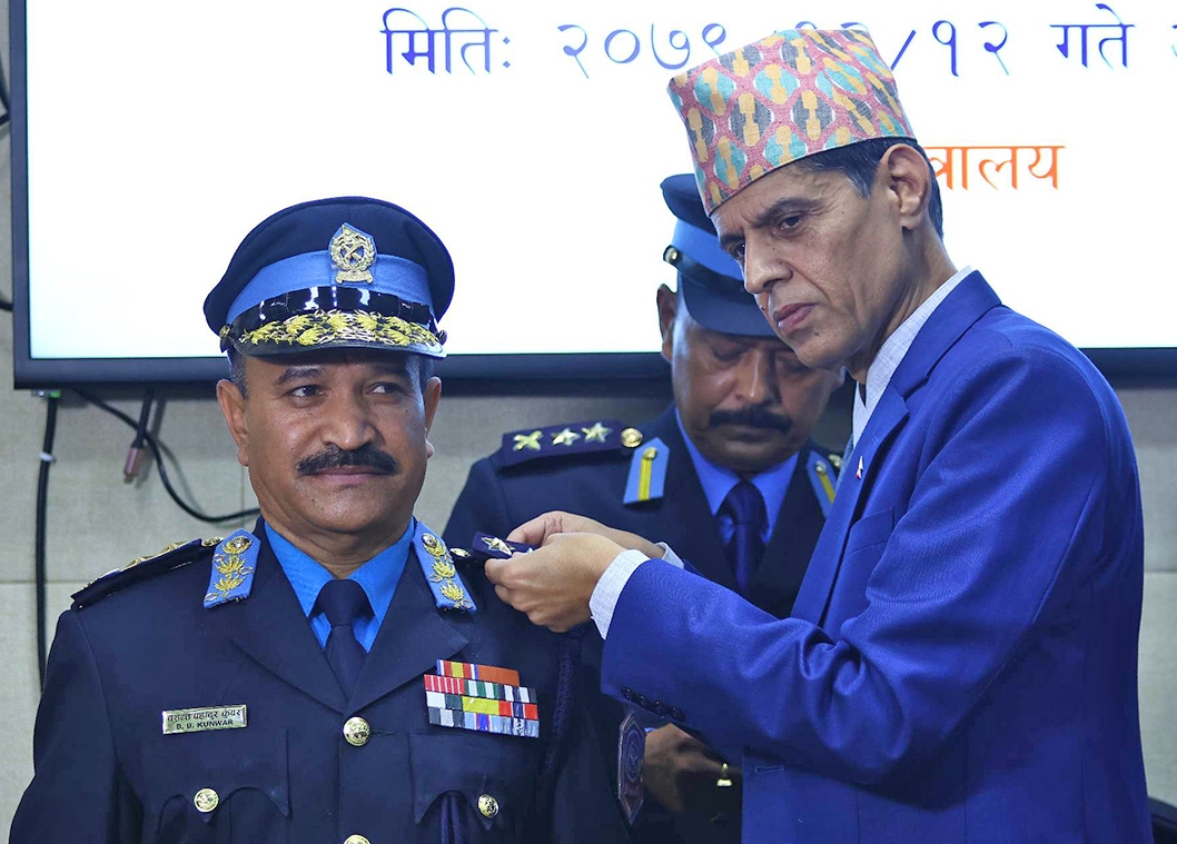काठमाडौं, १२ चैत्र । नेपाल प्रहरीका नवनियुक्त महानिरीक्षक (आईजीपी) बसन्तबहादुर कुँवरले आज दर्ज्यानी चिह्न लगाएका छन् । उनलाई गृह मन्त्रालयका सचिव विनोद प्रकाश सिंहले आज आईजीपीको दर्ज्यानी चिह्न लगाइदिएका हुन् ।