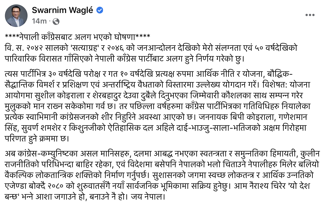 आफ्नो ५० वर्षदेखिको पारिवारिक विरासत गाँसिएको कांग्रेस पार्टी छोडेको वाग्लेले लेखेका छन् । ‘२०४२ सालको सत्याग्रह र २०४६ को जनआन्दोलन देखिको मेरो संलग्नता एवं ५० वर्षदेखिको पारिवारिक विरासत गाँसिएको नेपाली काँग्रेस पार्टीबाट अलग हुने निर्णय गरेको छु,’ उनले लेखेका छन्,’ पार्टीभित्र ३० वर्षदेखि परोक्ष र गत १० वर्षदेखि प्रत्यक्ष रुपमा आर्थिक नीति र योजना, बौद्धिक(सैद्धान्तिक विमर्श र प्रशिक्षण एवं अन्तर्राष्ट्रिय वैधताको विस्तारमा उल्लेख्य योगदान गरें । विशेषत : योजना आयोगमा सुशील कोइराला र शेरबहादुर देउवा दुबैले दिनुभएका जिम्मेवारी कौशलका साथ सम्पन्न गरेर मुलुकको मान राख्न सकेकोमा गर्व छ । तर पछिल्ला वर्षहरुमा काँग्रेस पार्टीभित्रका गतिविधिहरु नियालेका प्रत्येक स्वाभिमानी कांग्रेसजनको शीर निहुरिने अवस्था आएको छ ।
