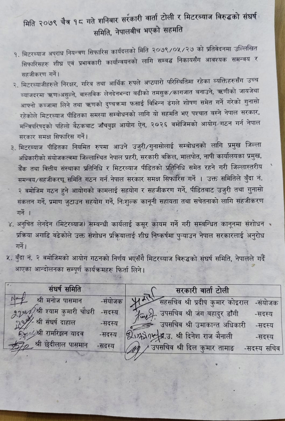 सरकारबी वार्ता टोली र र पीडितहरुको वार्ता टोलीबीच मिटरब्याज पीडितको समस्या समाधानका लागि आयोग गठन गर्नेसहितका ५ बुँदे सहमति भएको छ ।‘मिटरब्याजीहरूले निरक्षर, गरिब तथा आर्थिक रुपले अप्ठ्यारो परिस्थितिमा रहेका व्यक्तिहरुसँग उच्च ब्याजदरमा ऋण असुल्ने, वास्तविक लेनजदेनभन्दा बढीको तमसुकरकागजात बनाउने, ऋणीको जायजेथा आफ्नो कब्जामा लिने तथा ऋणको दुष्चक्रमा फसाई विभिन्न ढंगले शोषणसमेत गर्ने गरेको गुनासो रहेकोले मिटरब्याज पीडितका समस्या सम्बोधनको लागि यो सहमित भएपछि बस्ने मन्त्रिपरिषदको पहिलो बैठकबाट जाँचबुझ आयोग ऐन २०२६ बमोजिमको आयोग गठन गर्न नेपाल सरकार समक्ष सिफारिस गर्ने,’ सहमतिको पहिलो बुँदामा लेखिएको छ ।
