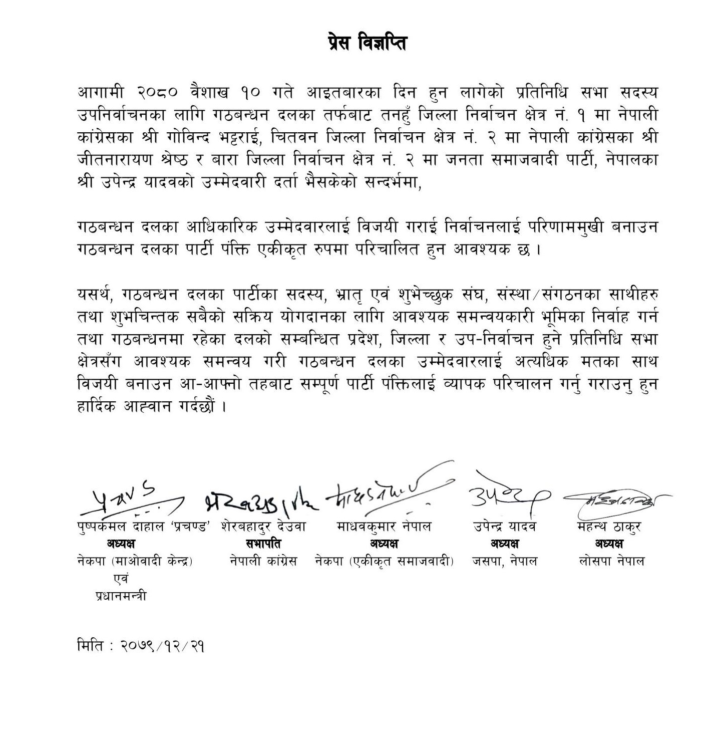 वैशाख १० गते आइतबार हुने उपनिर्वाचनमा गठबन्धनका तर्फबाट तनहुँ १ मा कांग्रेसका गोबिन्द भट्टराई, चितवन २ मा कांग्रेसकै जितनारायण श्रेष्ठ र बारा २ मा जसपाका उपेन्द्र यादव आधिकारिक उम्मेदवार हुन्। पाँच शीर्ष नेताले साझा उम्मेदवार जिताउन गठबन्धन दलका पार्टीका सदस्य, भ्रातृ एवं शुभेच्छुक संघ,संस्था, संगठनमा आबद्ध सबैलाई सक्रिय योगदान गर्न आह्वान गरेका छन्।