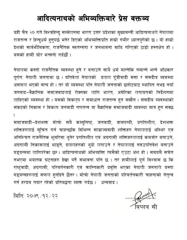 मुख्यमन्त्री आदित्यनाथले नेपालमा राजतन्त्र र हिन्दु धर्म हुनुपर्छ भनेर अभिव्यक्ति दिएपछि आज एक विज्ञप्ति जारी गर्दै विप्लवले आपत्ति जनाएका हुन् ।