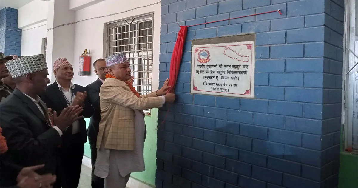 धनगढी उपमहानगरपालिका–१३ राजपुरमा आज प्रादेशिक आयुर्वेद चिकित्सालय भवनको उद्घाटन गर्दै उहाँले दिन प्रतिदिन आयुर्वेद चिकित्सा प्रणालीतर्फ सबैको आस्था बढ्दै गएको बताउनुभयो ।
