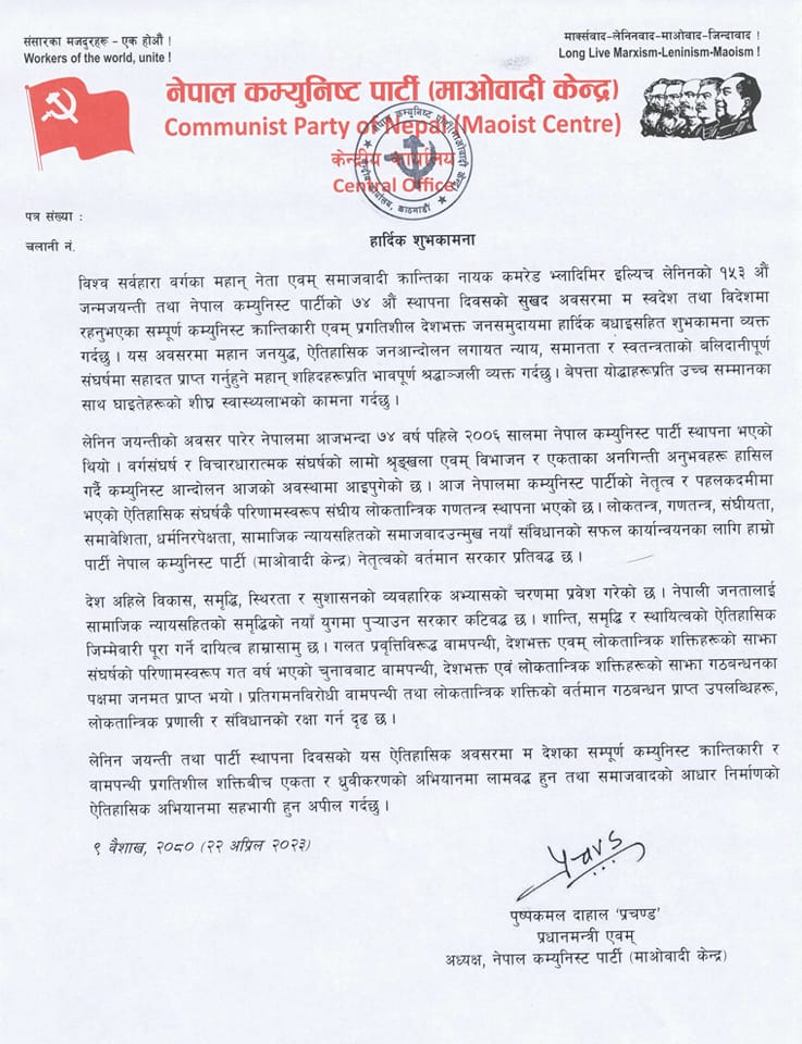 विश्व सर्वहारा वर्गका महान् नेता भ्लादिमिर इल्यिच लेनिनको १५३ औँ जन्मजयन्ती तथा नेपाल कम्युनिस्ट पार्टीको ७४ औँ स्थापना दिवसको अवसरमा शएक सन्देश जारी गर्दै प्रधानमन्त्री प्रचण्डले वर्गसंघर्ष र विचारधारात्मक संघर्षको लामो शृङ्खला एवम् विभाजन र एकताका अनगिन्ती अनुभवहरू हासिल गर्दै कम्युनिस्ट आन्दोलन आजको अवस्थामा आइपुगेको बताए ।