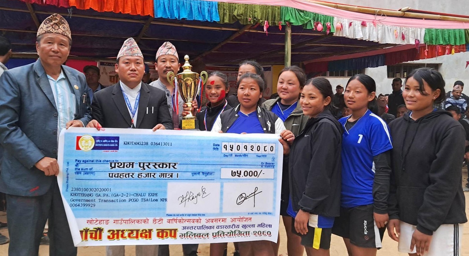 खोटेहाङको छैटौँ वार्षिकोत्सवको अवसरमा अन्तरपालिका वडास्तरीय पुरुष तथा महिला भलिबल प्रतियोगिता आयोजना गरिएको हो । खोटेहाङ–३ सावाकटहरेस्थित सावाकाली माध्यमिक विद्यालयको मैदानमा शुक्रबार सम्पन्न पुरुष भलिबल प्रतियोगिताको विजेता सभापोखरी–३ ले एक लाख १५ हजार, ट्रफी, मेडल र प्रमाणपत्र प्राप्त गर्यो । सो स्पर्धामा भोजपुरको रामप्रसाद राई–५ मानेभञ्ज्याङ दोस्रो भइ ७० हजार प्राप्त गर्यो ।