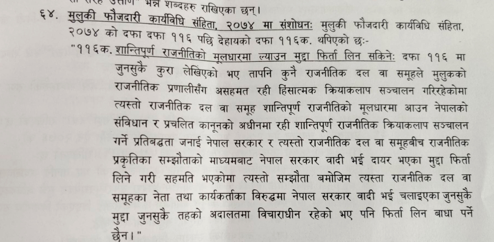 सरकारले मुलुकी फौजदारी संहितामा नयाँ व्यवस्था नै गरेर राजनीतिक दलका कार्यकर्तामाथिका मुद्दा जुनसुकै अदालतमा विचाराधीन रहे पनि फिर्ता लिने व्यवस्था गर्नुपर्नाको कारणका रूपमा सहमति कार्यान्वयन रहेको उल्लेख गरेको छ । ‘मुलुकको राजनीतिक प्रणालीसँग असहमत रही हिंसात्मक क्रियाकलाप सञ्चालन गरिरहेको राजनीतिक दल वा समूहलाई राजनीतिको मूलधारमा ल्याउन,’ त्यस्तो व्यवस्था गर्नुपर्नाको कारणबारे लेखिएको छ, ‘त्यस्तो राजनीतिक दल वा समूहसँग राजनीतिक प्रकृतिका सम्झौताको माध्यमबाट भएको सहमतिबमोजिम मुद्दा फिर्ता लिनसक्ने व्यवस्था गर्न आवश्यक भएकोले ।’