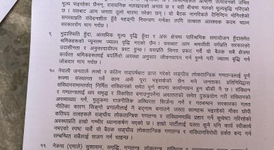 ८. आम नागरिकले थेग्नै नसक्ने गरी महङ्गी बढिरहेको छ। सरकारका गलत आर्थिक नीति, कालो बजारीलाई प्रश्रय, अनुगमनको अभाव, अनियन्त्रित बजार जस्ता कुराले तीब्र रुपमा मूल्य बृद्धि भइरहेको छ। एकातिर बजारमा शिथिलता आएको छ र रोजगारीका अवसरहरु घटेका छन्, आय–आर्जनका सामान्य विकल्पहरु पनि बन्द भएका छन् भने अर्कातिर बजार भाउ अचाक्ली बढेकाले नागरिकको चूल्हो बाल्नै धौ–धौ भइरहेको छ। किसानहरुले आफ्नो उत्पादनको उचित मूल्य पाइरहेका छैनन्, रासयनिक मलखादको अभाव छ र यही बीचमा मलको मूल्यबृद्धि गरिएको छ। यसबाट आम जनता ठूलो मारमा परेका छन्। यो बैठक नागरिकले दैनिन्दिन भोगिरहेको समस्याप्रति संवेदनशील हुँदै महङ्गी नियन्त्रण गर्नका लागि तत्काल आवश्यक कदम चाल्न सरकारसँग माग गर्दछ।