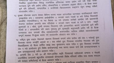 १४. राष्ट्रिय युवा सङ्घ नेपालको स्थापना दिवसको सन्दर्भ पारेर प्रत्येक वर्ष जेठ १ गतेलाई युवा दिवसका रुपमा मनाइँदै आएको छ। यस वर्षको युवा दिवसका सन्दर्भमा नेपालका सबै युवा विद्यार्थीहरुमा यो बैठक हार्दिक वधाइ तथा शुभकामना व्यक्त गर्दछ र युवा दिवसका सन्दर्भमा जेठ १ गते आयोजना हुने विशेष कार्यक्रमलाई भव्य रुपमा सफल पार्न सबै जनसङ््गठनहरु र आम जनसमुदायलाई समेत आह्वान गर्दछ।