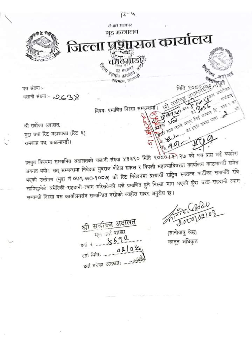 ‘निवेदक युवराज पौडेल सफल र प्रत्यार्थीरविपक्षी महान्यायाधिवक्तको कार्यालय रामशाहपथ काठमाडौ समेत भएको उत्प्रेषण समेत विषयको रिट निवेदनमा मिति २०७९ /१२/२२ मा प्रस्तुत मुद्दाका प्रत्यर्थी राष्ट्रिय स्वतन्त्र पार्टीका सभापति रवि लामिछानेले अमेरिकी राहदानी त्याग गरिसकेको भन्ने प्रमाणित हुने निस्सा अध्यागमन विभाग वा जिल्ला प्रशासन कार्यालय, काठमाडौं जहाँ भएपनि झिकाई पेश गर्नु भनी भएको आदेशनुसार प्रस्तुत पत्र लेखिएको छ,’ सर्वोच्चको पत्रमा भनिएको थियो।