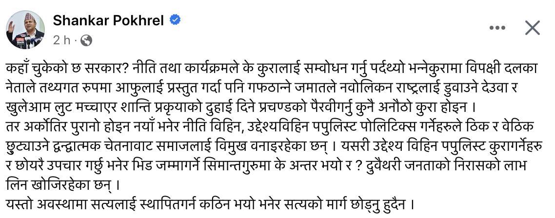 ‘कहाँ चुकेको छ सरकार ? नीति तथा कार्यक्रमले के कुरालाई सम्बोधन गर्नु पर्थ्यो भन्ने कुरामा विपक्षी दलका नेताले तथ्यगत रूपमा आफूलाई प्रस्तुत गर्दा पनि गफ ठान्ने जमातले नबोलिकन राष्ट्रलाई डुवाउने देउवा र खुलेआम लुट मच्चाएर शान्ति प्रक्रियाको दुहाइ दिने प्रचण्डको पैरवी गर्नु कुनै अनौठो कुरा होइन,’ उनले आरोप लगाएका छन्।