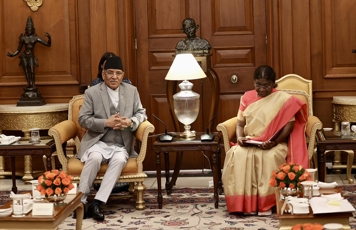 नयाँ दिल्लीस्थित राष्ट्रपति कार्यालयमा प्रधानमन्त्री प्रचण्ड र भारतीय राष्ट्रपति मुर्मुबीच भेटवार्ता भएको हो ।भेटमा द्विपक्षीय हितका विविध विषयमा विचारविमर्श भएको प्रधानमन्त्रीको सचिवालयले जनाएको छ।भेटमा नेपाली प्रतिनिधिमण्डलको सहभागिता रहेको थियो। यसअघि आजै प्रधानमन्त्री दाहाल प्रचण्डले हैदरावाद हाउसमा भारतीय समकक्षी नरेन्द्र मोदीसँग भेटवार्ता गरेका थिए। त्यसलगत्तै दुई देशका बीचमा विभिन्न सहमति तथा सम्झौतामा हस्ताक्षर भएको थियो ।
