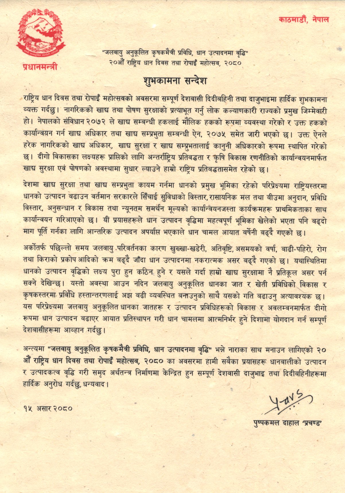 काठमाडौं १५ असार । आज धान दिवस मनाइँदै छ । धान दिवसको उपलक्ष्यमा प्रधानमन्त्री पुष्पकमल दाहाल प्रचण्डले वक्तव्यमार्फत किसानहरुलाई शुभकामना दिएका छन