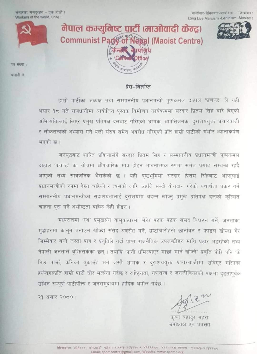 जनयुद्धबाट शान्ति प्रक्रियासँगै सरदार प्रितम सिंह र सम्माननीय प्रधानमन्त्री पुष्पकमल दाहाल ‘प्रचण्ड’का बीचमा औपचारिक मात्र होइन भावनात्मक रुपमा समेत प्रगाढ सम्बन्ध रहँदै आएको तथ्य यसअघि नै प्रष्ट भइसकेको माओवादी केन्द्रले जनाएको छ।