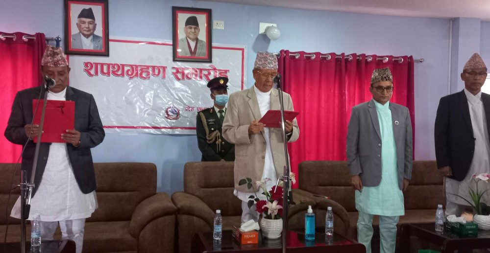 तीन जना मन्त्री नियुक्त गरेर प्रदेश प्रमुख समक्ष पद तथा गोपनियताको शपथ लिने मुख्यमन्त्री थापाको तयारी थियो । तर मन्त्रीका लागि माओवादीमा विवाद भएपछि थापाले मुख्यमन्त्रीमा निर्धारित समयभन्दा एक घन्टा ढिलो शपथ ग्रहण गरेमा थिए ।
