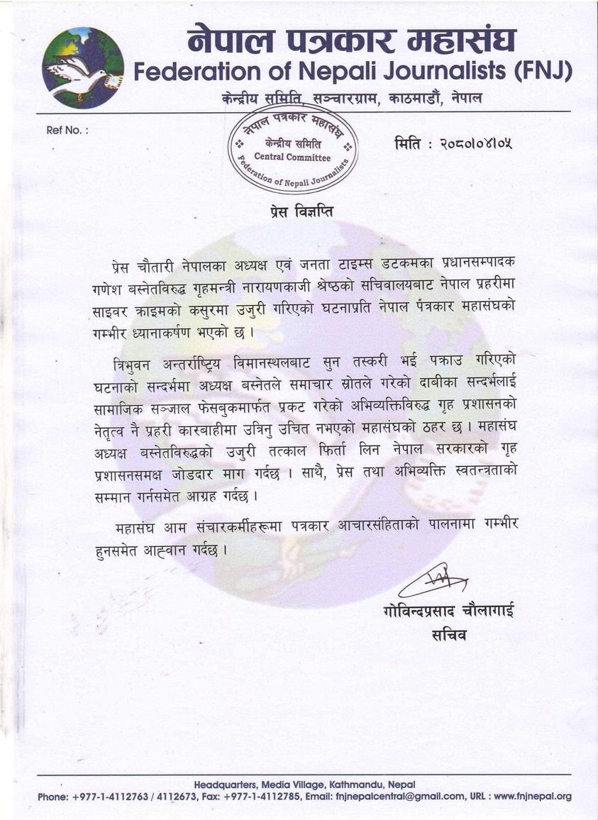 सचिव गोविन्दप्रसाद चौलागाईले शुक्रबार एक विज्ञप्ति जारी गर्दै त्रिभुवन अन्तर्राष्ट्रिय विमानस्थलबाट सुन तस्करी भई पक्राउ गरिएको घटनाको सन्दर्भमा अध्यक्ष बस्नेतले समाचार स्रोतले गरेको दाबीका सन्दर्भलाई सामाजिक सञ्जाल फेसबुकमार्फत प्रकट गरेको अभिव्यक्तिविरूद्ध गृह प्रशासनको नेतृत्व नै प्रहरी कारबाहीमा उत्रिनु उचित नभएको उल्लेख गरेका छन्। यस्तै महासंघले अध्यक्ष बस्नेतविरूद्धको उजुरी तत्काल फिर्ता लिन गृहप्रशासन समक्ष माग गरेको छ। साथै, प्रेस तथा अभिव्यक्ति स्वतन्त्रताको सम्मान गर्न समेत आग्रह गरेको छ।