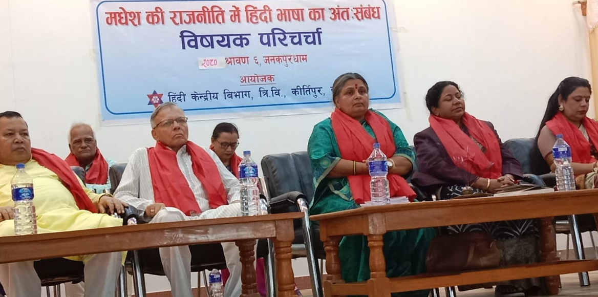 त्रिभुवन विश्वविद्यालय हिन्दी केन्द्रीय विभागले शनिबार जनकपुरधाममा आयोजना गरेको ‘मधेसको राजनीतिमा हिन्दी भाषाको अन्तरसम्बन्ध’ विषयक परिचर्चा कार्यक्रममा सरोकारवालाले मधेसमा धेरै पहिलेदेखि नै बोलिने हिन्दी भाषा अधिकांशको सम्पर्क भाषाको रूपमा रहेकाले सरकारले हिन्दीलाई कामकाजको भाषाको मान्यता दिनुपर्ने बताए। कार्यक्रममा सङ्घीय सरकारका शिक्षा, विज्ञान तथा प्रविधि राज्यमन्त्री प्रमिलाकुमारी यादवले हिन्दी भाषाले विगतदेखि नै नेपाल र भारतको सम्बन्ध जोड्नमा महत्त्वपूर्ण भूमिका खेल्दै आएकाले यसलाई सम्पर्क भाषाको मान्यता दिनु अपरिहार्य रहेको भनाइ राखे। मधेसभित्र नागरिक तह र राजनीतिकरूपमा दुई देशबीच महत्त्वपूर्ण सन्देश आदान–प्रदानका लागि हिन्दीले महत्त्वपूर्ण योगदान पुर्याएको उनको भनाइ थियो।