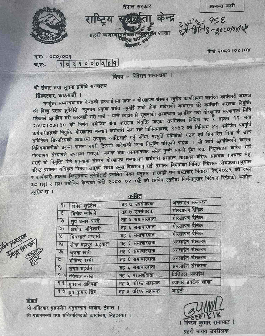 सो कार्य छानबिनको क्रममा गोरखापत्र संस्थानले उपलब्ध गराएको जवाफ तथा कागजातबाट समेत पुष्टि भएको’ सतर्कता केन्द्रले जनाएको छ ।त्यसैले ती नियुक्तिहरु खारेज गरी गोरखापत्र संस्थानको कर्मचारी प्रशासन शाखाका वरिष्ठ सहायक रुपचन्द्र भट्ट, वरिष्ठ प्रशासन अधिकृत विमला खड्का, शाखा प्रमुख विक्रमबाबु राई, प्रशासन विभागका निमित्त निर्देशक ओमप्रकाश भुसाल र कार्यकारी निर्देशक विष्णुप्रसाद सुवेदीलाई कारबाही गर्न सतर्कता केन्द्रले सञ्चार मन्त्रालयलाई निर्देशन दिएको छ ।