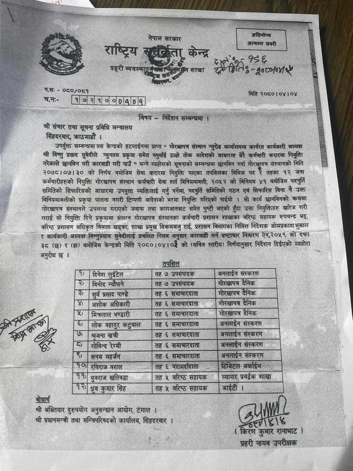 निर्देशनपत्रमा अगाडि भनिएको छ, ‘सो कार्य छानबिनको क्रममा गोरखापत्र संस्थानले उपलब्ध गराएको जवाफ तथा कागजातबाट समेत पुष्टि भएको हुँदा उक्त नियुक्तिहरू खारेज गरी गराई सो नियुक्ति दिने प्रक्रियायामा संलग्न गोरखापत्र संस्थानका कर्मचारी प्रशासन शाखाका वरिष्ठ सहायक रूपचन्द्र भट्ट, वरिष्ठ प्रशासन अधिकृत विमला खड्का, शाखा प्रमुख विक्रमबाबु राई, प्रशासन विभागका निमित्त निर्देशक ओमप्रकाश भुसाल र कार्यकारी अध्यक्ष विष्णुप्रसाद सुवेदीलाई प्रचलित नियमअनुसार कारबाही गर्न भ्रष्टाचार निवारण ऐन, २०५९ को दफा ३८ (छ) र (झ) बमोजिम केन्द्रको मिति २०८०।०४।०३ को (सचिव स्तरीय) निर्णयानुसार निर्देशन दिइएको बेहोरा अनुरोध छ।’