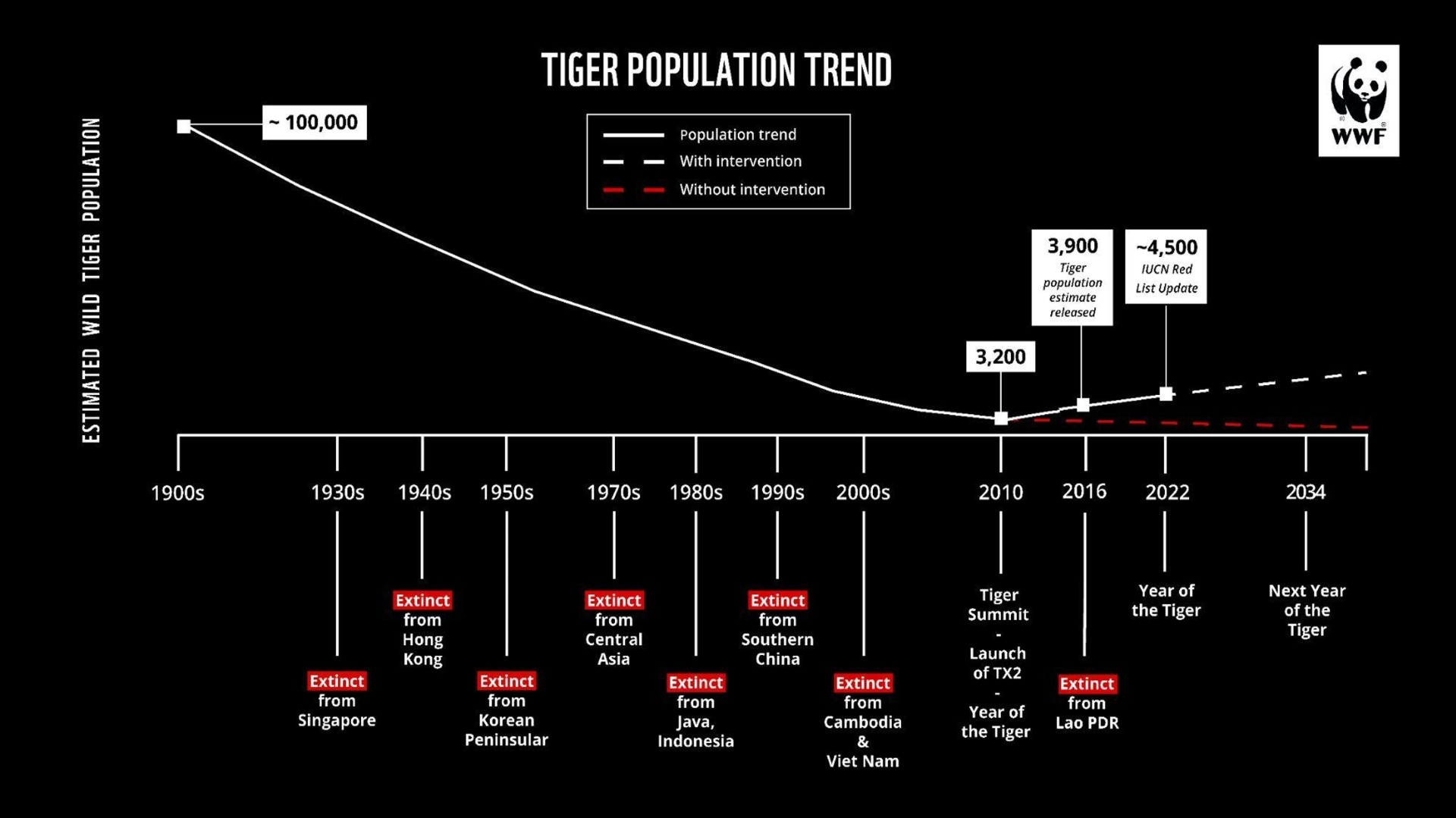 विश्वभर सन् १९०० सम्म एक लाखको हाराहारीमा बाघको सङ्ख्या रहेको अनुमान थियो । त्यो सङ्ख्या सन् २०१० मा घटेर तीन हजार दुई सयमा सीमित भएको थियो । त्यसपछिका विश्वभरबाट भएका संरक्षणका प्रयासले बाघको सङ्ख्या बढेर २०१६ मा तीन हजार नौ सय र सन् २०२२ मा चार हजार पाँच सय पुगेको विश्व वन्यजन्तु कोषको तथ्याङ्क छ ।