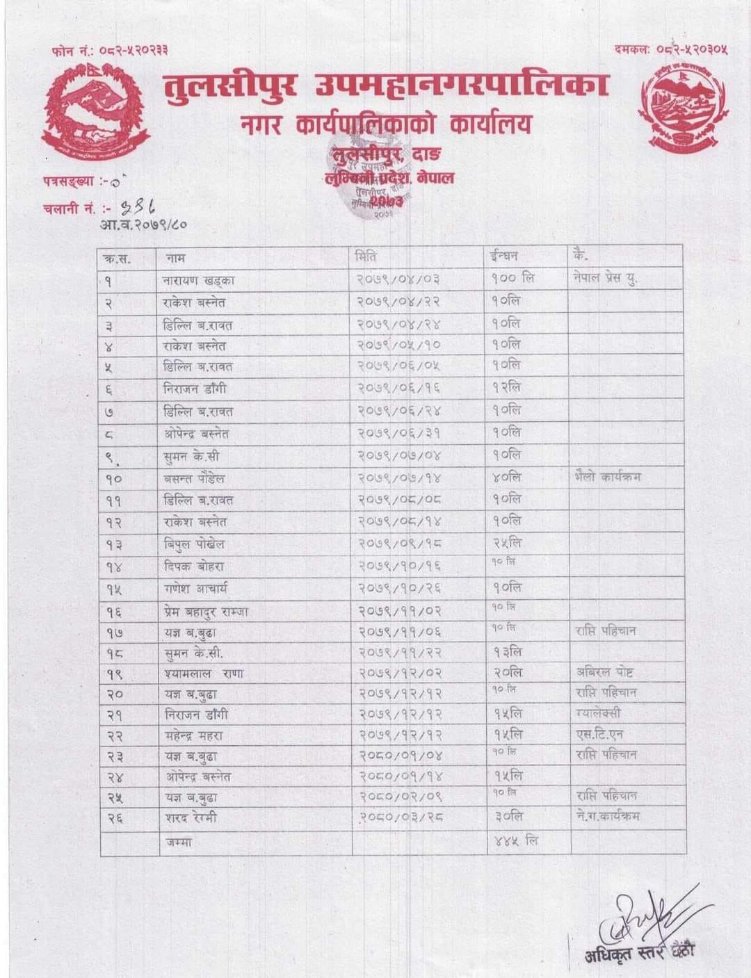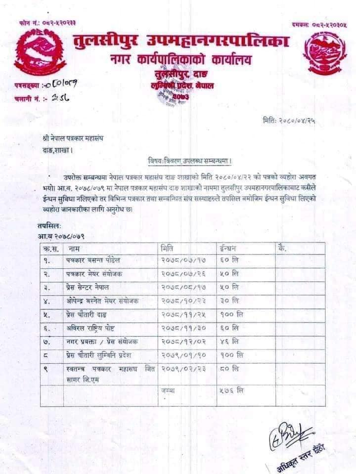 उपमहानगरपालिकाले सार्वजनिक गरेको विवरणअनुसार इन्धन सुविधा लिने पत्रकारको सूचीमा नेपाल पत्रकार महासंघका केन्द्रीय अध्यक्ष विपुल पोखरेलको पनि नाम छ। व्यक्तिगत तथा संस्थागत (पत्रकार संगठन) रूपमा ३५ पत्रकारले १० देखि सय लिटरसम्म तेल लगेको तुलसीपुर उपमहानगरपालिकाले जनाएको छ।