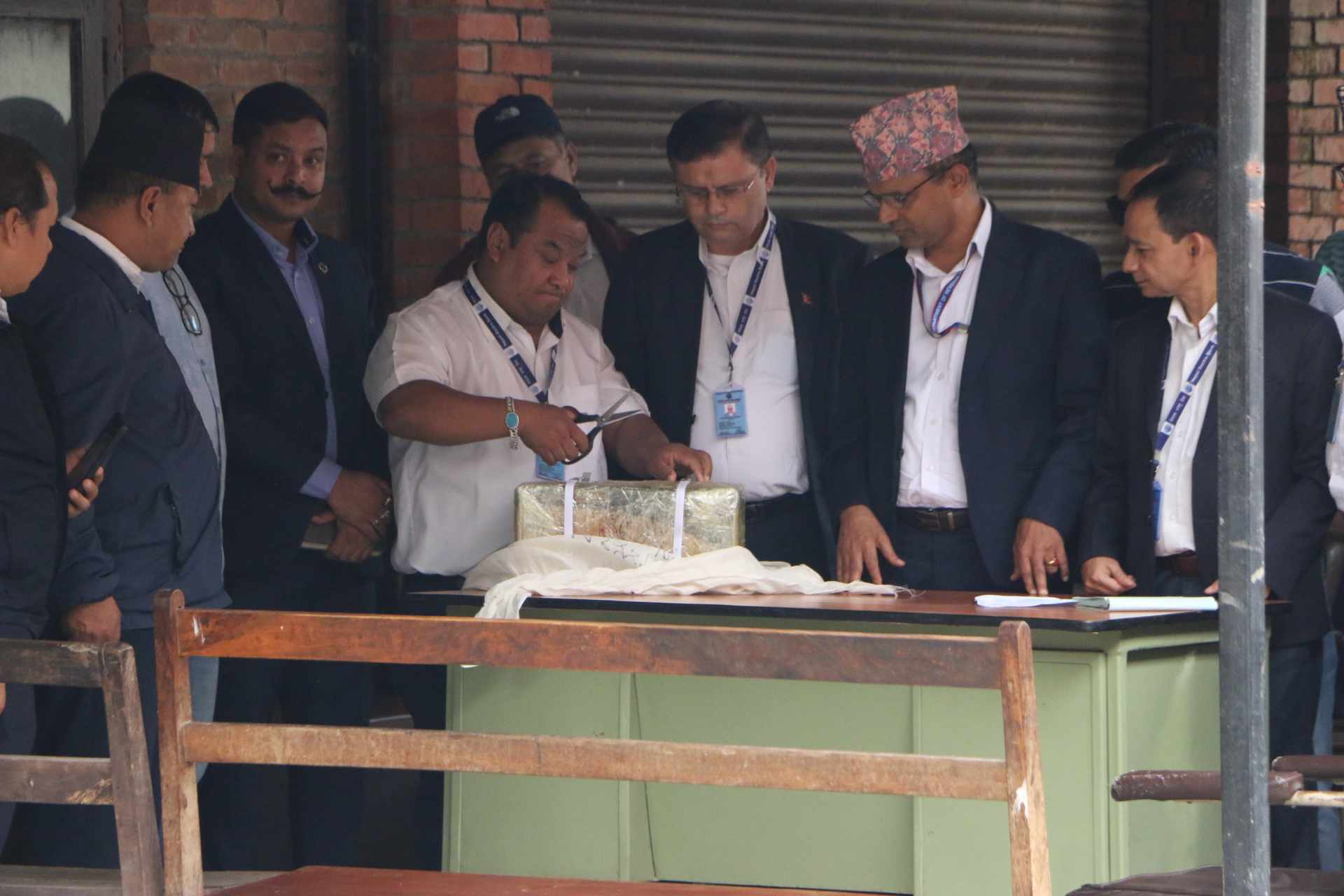 एउटा प्याकेट खोलेर देखाएपछि तीनै निकायका टोली अरु कार्टु खोलेर जोख्न भित्र पसेका छन्।