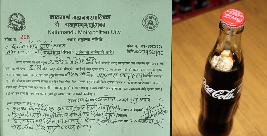 ‘अखाद्य पदार्थ देखिएका उत्पादन तुरुन्त फिर्ता लैजानु पर्नेछ । सिलबन्दी राम्रो नभएको बोतल कम्पनीबाट गर्नु र डिस्टिब्युटरबाट रिटेलरमा सामग्री दिँदा पूर्णरुपमा चेक जाँच गरेर मात्र पठाउनु होला,’ जरिवाना गरेको पत्रमा उल्लेख छ।