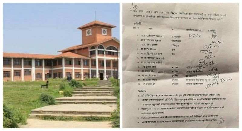 काठमाडौ भदौ १४ । त्रिभुवन विश्वविद्यालयले इञ्जिनियरिङ अध्ययन संस्थानलाई वृद्धि गरेको शुल्क फिर्ता लिन निर्देशन दिएको छ । उपकुलपति धर्मकान्त बास्कोटासहित पदाधिकारी र आन्दोलन गर्दै आएका विद्यार्थी सङ्गठनबीच ५ बुँदे सहमतिपछि त्रिविले बढेको शुल्क फिर्ता लिन निर्देशन दिएको हो ।हिजो भएको छलफलमा विश्वविद्यालयका तर्फबाट उपकुलपति बास्कोटा र ५ विद्यार्थी सङ्गठनका प्रतिनिधिलगायत सहभागी थिए ।