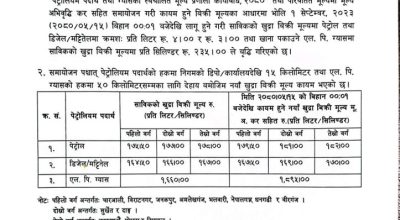 काठमाडौ भदौ १५ । नेपाल आयल निगमले पेट्रोल, डिजेल, मट्टितेल र खाना पकाउने ग्यासमा मूल्यवृद्धि गरेको छ ।बिहीबार राति बसेको निगम सञ्चालक समितिले पेट्रोलमा प्रतिलिटर ४, डिजेल र मट्टितेलमा प्रतिलिटर ३ र खाना पकाउने ग्यासमा प्रतिसिलिण्डर २३५ रुपैयाँ वृद्धि गरेको हो । अब काठमाडौंमा पेट्रोलको मूल्य एक लिटरको १७८ रुपैयाँ पुगेको छ ।त्यस्तै डिजेल र मट्टितेलको १६७ र खाना पकाउने ग्यासको मूल्य प्रतिसिलिण्डर १८९५ रुपैयाँ पुगेको छ ।
