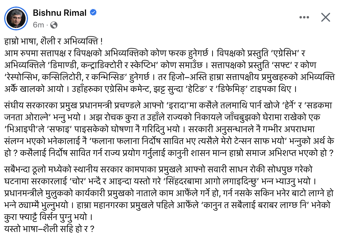आम रुपमा सत्तापक्ष र विपक्षको अभिव्यक्तिको कोण फरक हुनेगर्छ । विपक्षको प्रस्तुति ‘एग्रेसिभ’ र अभिव्यक्तिले ‘डिमाण्डी, कन्ट्राडिक्टोरी र स्केप्टिभ’ कोण समाउँछ । सत्तापक्षको प्रस्तुति ‘सफ्ट’ र कोण ‘रेस्पोन्सिभ, कन्सिलिटोरी, र कन्भिन्सिङ’ हुनेगर्छ । तर हिजो–अस्ति हाम्रा सत्तापक्षीय प्रमुखहरुको अभिव्यक्ति अर्कै खालको आयो । उहाँहरुका एग्रेसिभ कमेन्ट, झट्ट सुन्दा ‘हेटिङ’ र ‘डिफेमिङ्’ टाइपका थिए ।