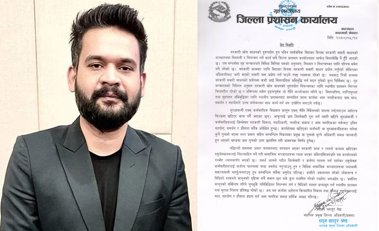 जिल्ला प्रशासन कार्यालयले सार्वजनिक विदाको दिनमा सरकारी गाडी प्रयोग गर्दा तोकिएका अधिकारीबाट जारी भएको सवारी पास बोक्नुपर्ने नियम समेत सम्झाएको छ ।