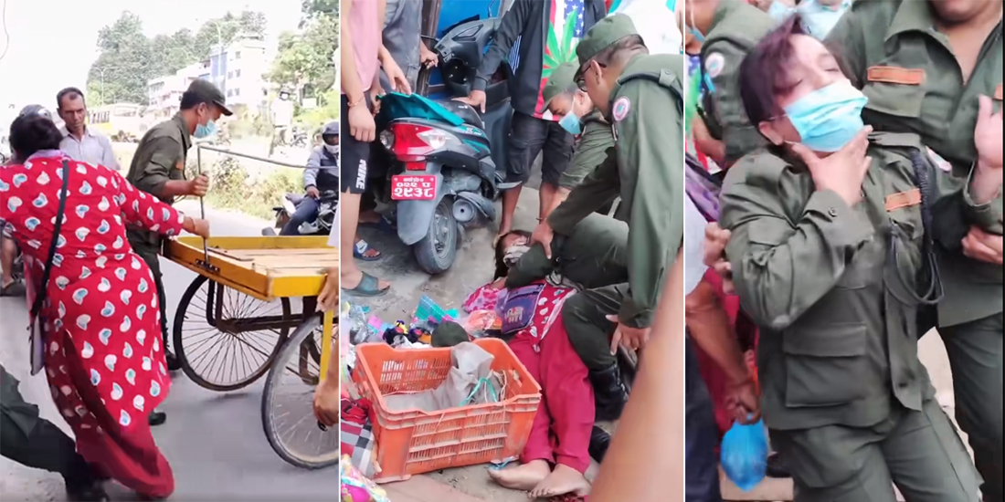 ठेलामा सामान राखेर बेच्दै गरेकी एक महिलाको नगरप्रहरीले गाडा खोसेपछि ती महिला र नगरप्रहरी बीच भएको मुडभेडमा घाँटी न्याकेको भिडियो अहिले सामाजिक सञ्जालमा भाइरल बनेको छ ।