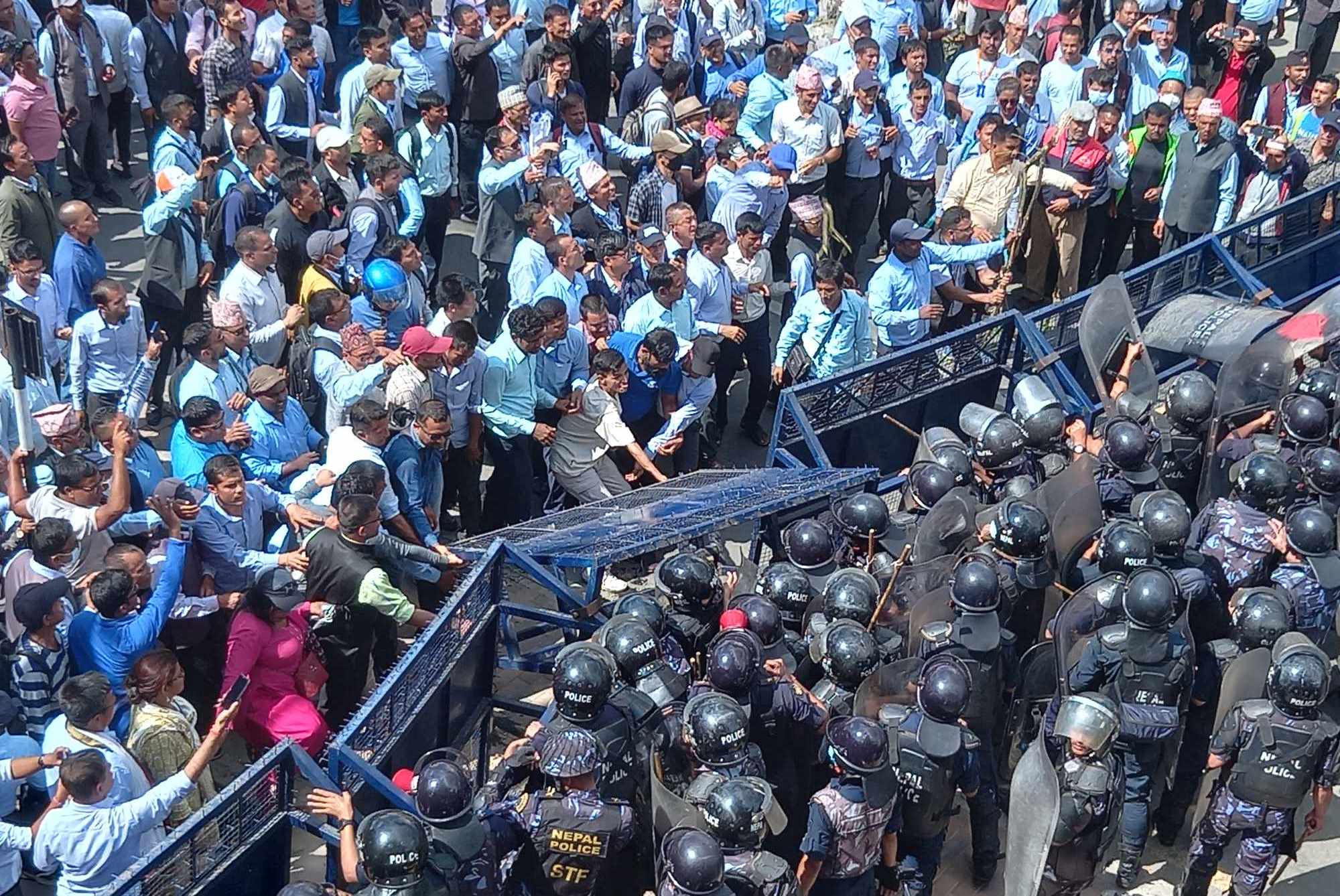 शिक्षकहरूले सुरक्षाकर्मीहरूमाथि पानीको बोतलले समेत प्रहार गरेका छन् ।