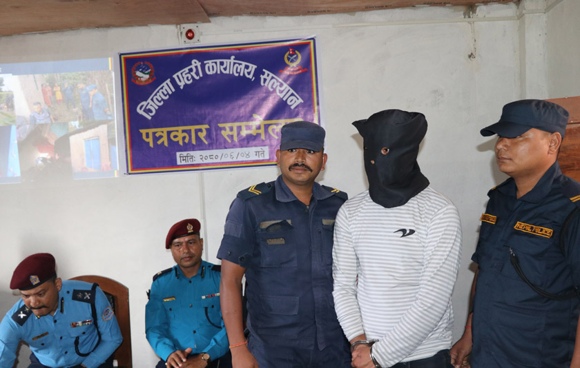 हत्या गरेको आरोपमा प्रहरीले सल्यान सिद्ध कुमाख गाउँपालिका २ खानीगाउँका २८ वर्षीय कर्ण बहादुर बस्नेतलाई पक्राउ गरेको हो। उनलाई घटना भएको पाँच दिन पछि सिद्ध कुमाख गाउँपाकिला ३ ढोरचौर बजारबाट बुधबार साँझ पक्राउ गरेको हो।