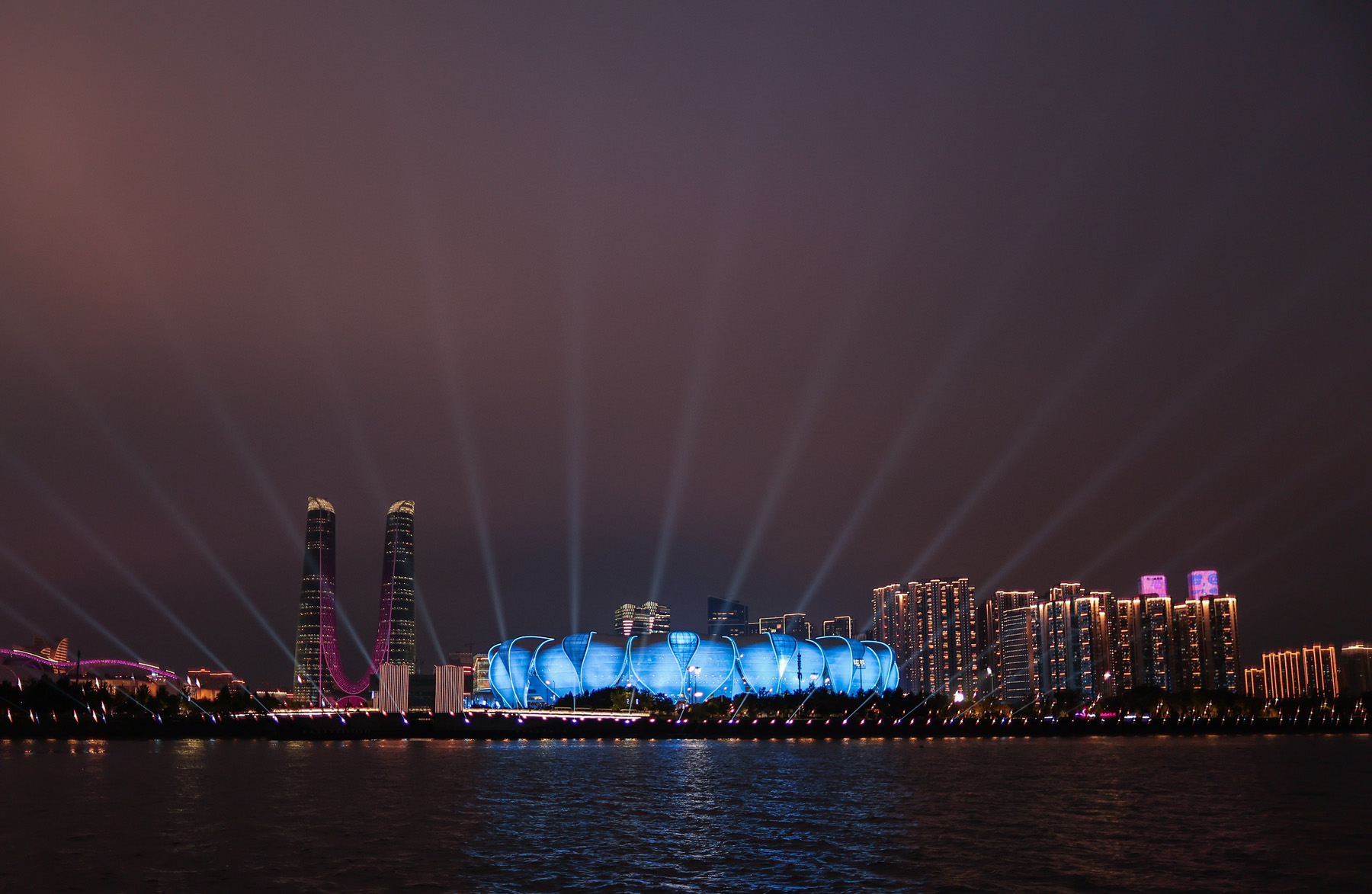(230923) — HANGZHOU, Sept. 23, 2023 (Xinhua) — Hangzhou Olympic Sports Center Stadium is lighted before the opening ceremony of the 19th Asian Games in Hangzhou, east China’s Zhejiang Province, Sept. 23, 2023. (Xinhua/Wu Zhuang)