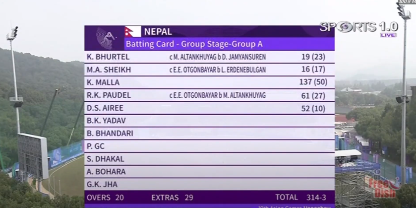 नेपालले निर्धारित २० ओभरमा ३ विकेट गुमाएर ३ सय १४ रन जोड्यो।नेपालका कुशल मल्लले एक सय ३७, रोहित पौडेलले ६१ र दीपेन्द्रसिंह ऐरीले ५२ रन बनाए। नेपालले टी–२० अन्तर्राष्ट्रिय क्रिकेटमा सर्वाधिक रन बनाउने विश्व कीर्तिमान बनाएको छ। यसअघि कुनै पनि टोलीले २ सय ७८ रनसम्म बनाएका थिए।