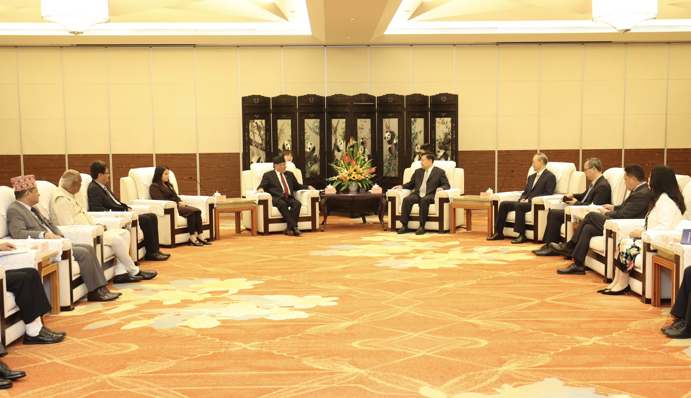 सो वार्तामा नेपालका तर्फबाट प्रधानमन्त्रीसहित परराष्ट्रमन्त्री नाराणप्रकाश साउद, भौतिक पूर्वाधार तथा यातायातमन्त्री प्रकाश ज्वाला, खानेपानीमन्त्री महिन्द्र राय यादव, प्रधानमन्त्रीका प्रमुख राजनीतिक सल्लाहकार हरिबोल गजुरेल, प्रधानमन्त्रीका प्रेस सल्लाहकार गोविन्द आचार्य, राष्ट्रिय सुरक्षा सल्लाहकार शङ्करदास वैरागी, मुख्यसचिव डा वैकुण्ठ अर्याल, विभिन्न मन्त्रालयका सचिवहरूको सहभागिता थियो । आजै साँझ प्रधानमन्त्री प्रचण्डको सम्मानमा सचिव सियाओइले रात्रिभोजको पनि आयोजना गरेका थिए । यसैबीच प्रधानमन्त्री प्रचण्डले छन्दुमा रहेको पान्डा अनुसन्धान तथा प्रजनन केन्द्रको अवलोकन गरेका थिए ।प्रधानमन्त्री प्रचण्डर उनको भ्रमण दलका सदस्यहरू शनिबार छन्दुबाटै काठमाडौँ फर्किने कार्यक्रम रहेको छ । प्रधानमन्त्री प्रचण्ड गएको शनिबारदेखि चीनको औपचारिक भ्रमणमा छन् । उनको भ्रमण दलमा उहाँकी छोरी गङ्गा दाहाल, परराष्ट्रमन्त्री नाराणप्रकाश साउद, भौतिक पूर्वाधार तथा यातायातमन्त्री प्रकाश ज्वाला, खानेपानीमन्त्री महिन्द्र राय यादव, प्रधानमन्त्री दाहालका प्रमुख राजनीतिक सल्लाहकार हरिबोल गजुरेल, राष्ट्रिय सुरक्षा सल्लाहकार शङ्करदास वैरागी, मुख्यसचिव डा वैकुण्ठ अर्याल, विभिन्न मन्त्रालयका सचिवहरू, निजी क्षेत्रका तर्फबाट छाता संस्था नेपाल उद्योग वाणिज्य महासङ्घका अध्यक्ष चन्द्रप्रसाद ढकालसहित अन्य व्यवसायी तथा सदस्यहरू रहेका छन् ।